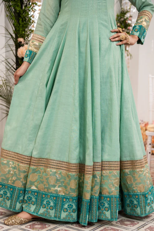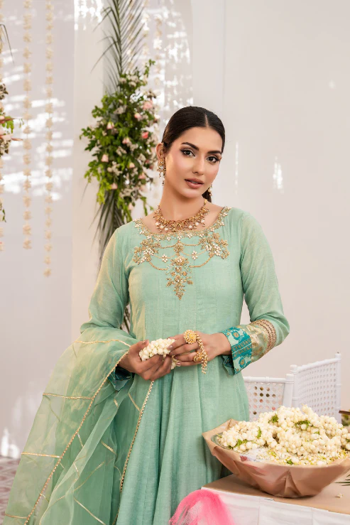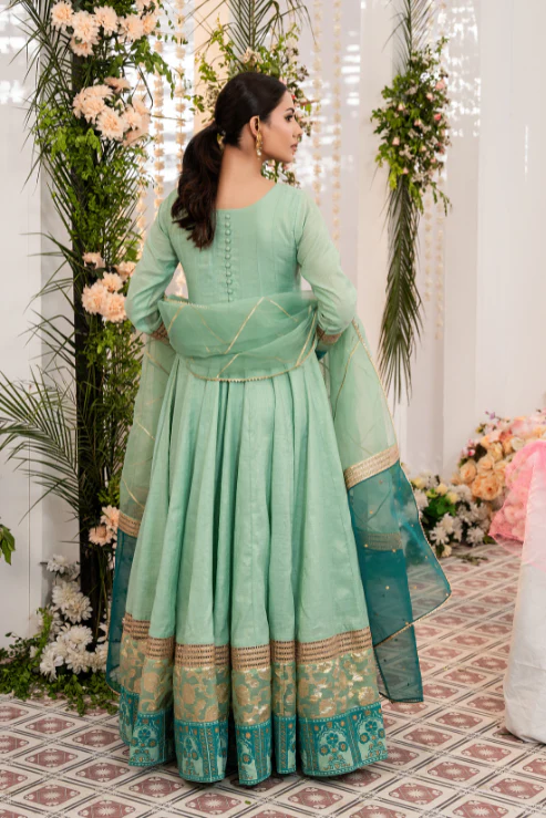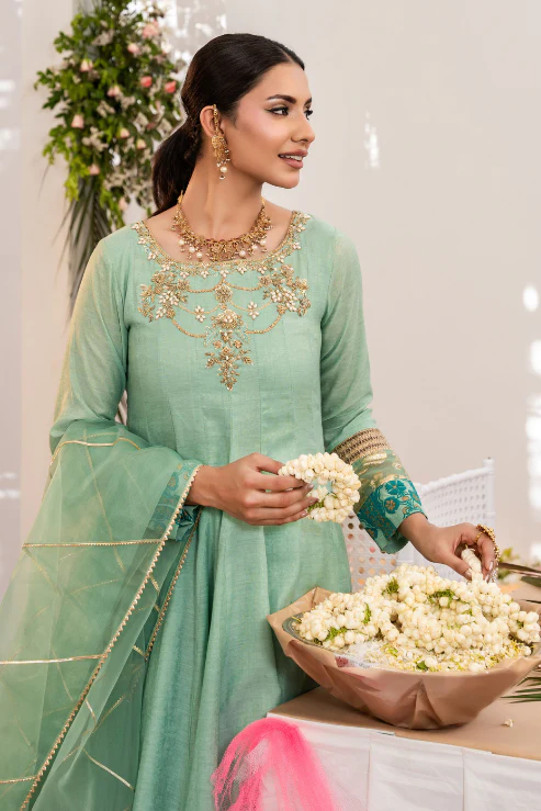 Drape yourself in the delicate charm of sea green with Hania — a breathtaking kalidar frock adorned with 40 flowing panels, intricate handwork, and a touch of tradition. Finished with a dreamy organza dupatta and handcrafted lace, this 2-piece look is made to make moments unforgettable.