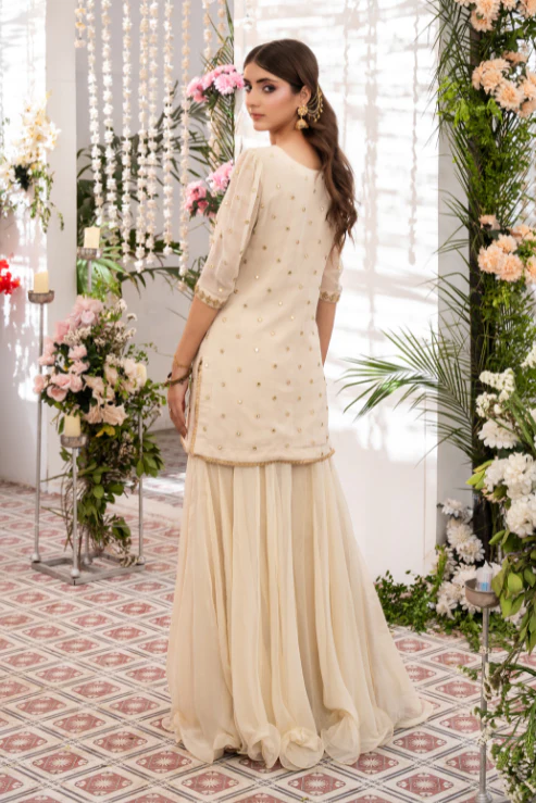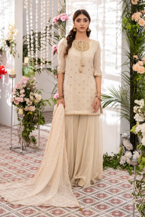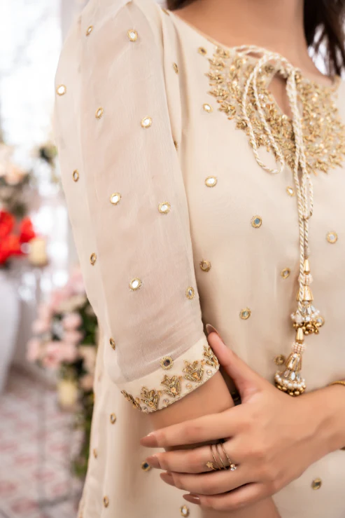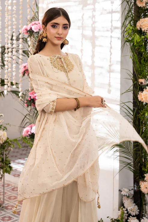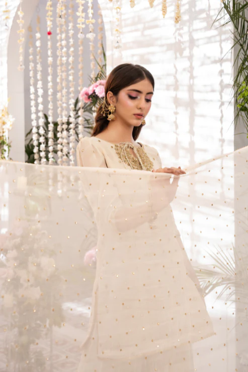 3-piece ensemble is a vision of timeless charm. The short shirt features radiant mirror work and handwork on the neckline, finished with kora and dabka detailing. Paired with a graceful Dhaka and a sequin-embroidered dupatta