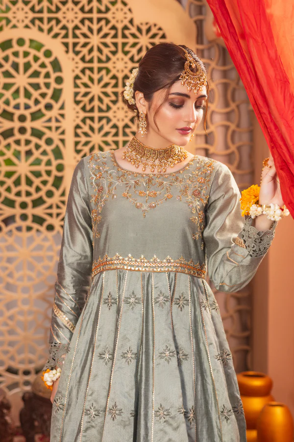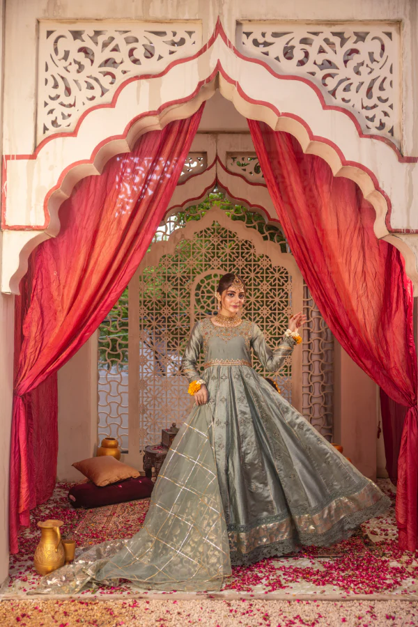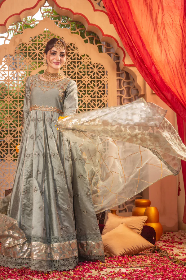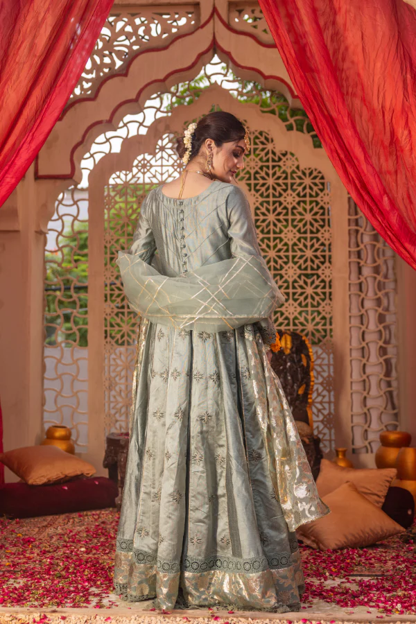 Modish Khadi silk ensemble showcases a beautifully embroidered Kalidar top with intricate handwork on the front, featuring Gota, Kora, Dabka, Zardozi, and Resham. The self-organza border with delicate laces adds a touch of sophistication. Paired with an organza dupatta trimmed with gota lace on all sides, this outfit is perfect for making an elegant statement on any special occasion.