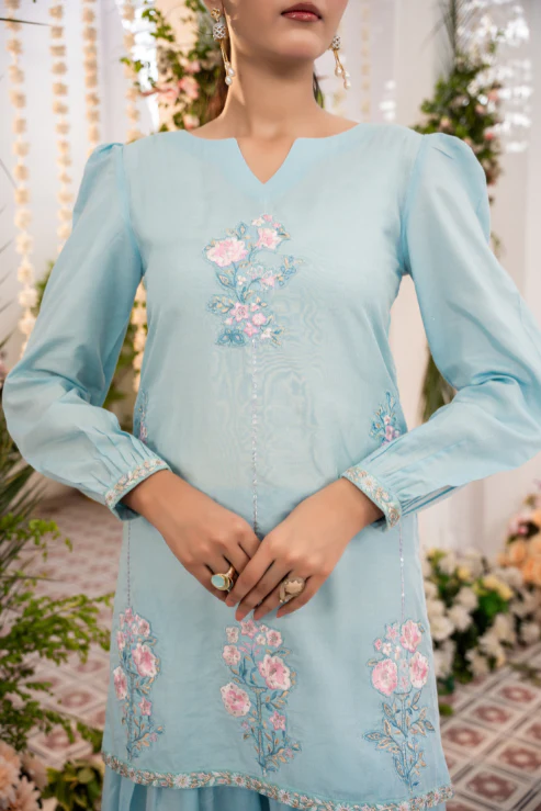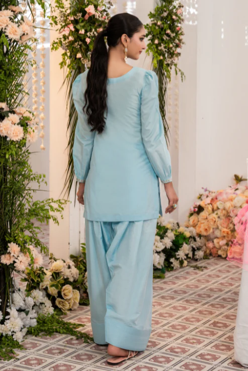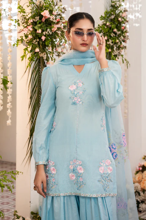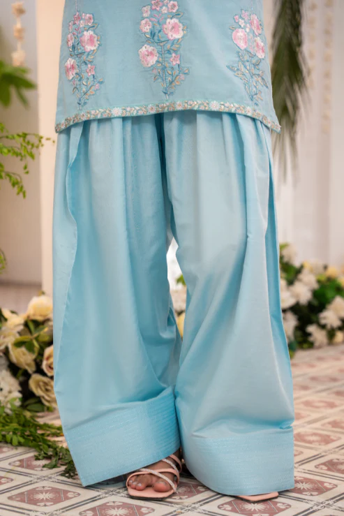 A sky blue vision in cotton silk, adorned with delicate floral embroidery and lace. Paired with a flowing farshi shalwar and an organza dupatta featuring block print and four-sided lace detailing, this 3-piece set is made for graceful celebrations.