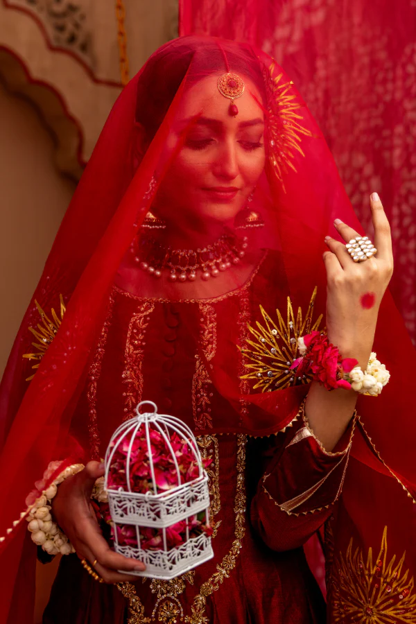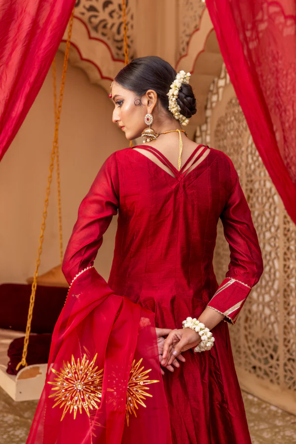 Enhance your style with this Khadi silk ensemble, featuring a beautifully hand worked neckline adorned with Kora Dabka and pearls. The outfit is paired with an organza dupatta, showcasing intricate block print and delicate handwork, making it a perfect blend of tradition and elegance.