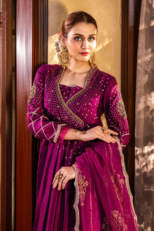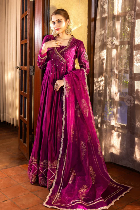 A magenta Angrakha frock in luxurious khadi silk, adorned with intricate handwork featuring kora, dabka, sitara, and pearls. Paired with raw silk straight pants and an organza dupatta with block print and lace, it’s a look crafted for celebrations!