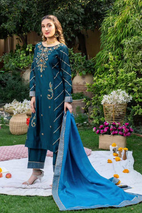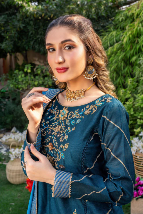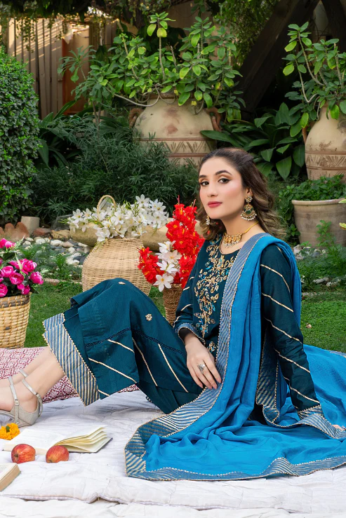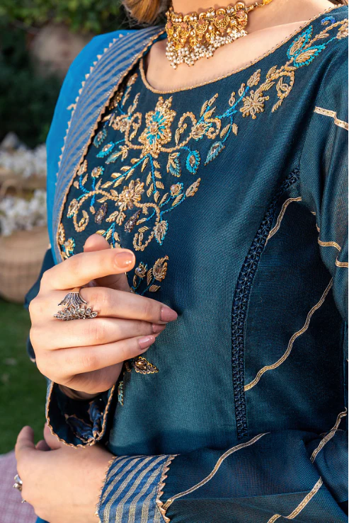 Draped in a mesmerizing zinc blue, Neha is a graceful 3-piece ensemble featuring a chic kurta and tailored trousers. A statement of sophistication, designed for those who love effortless charm.