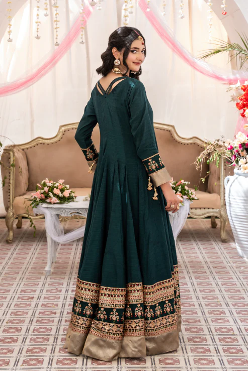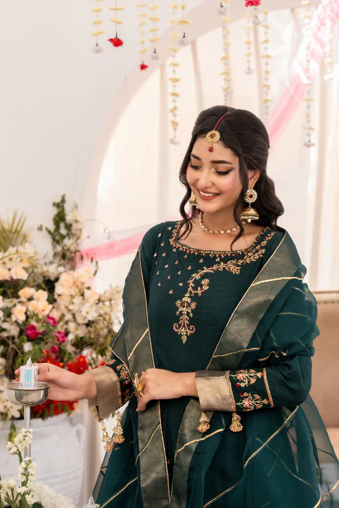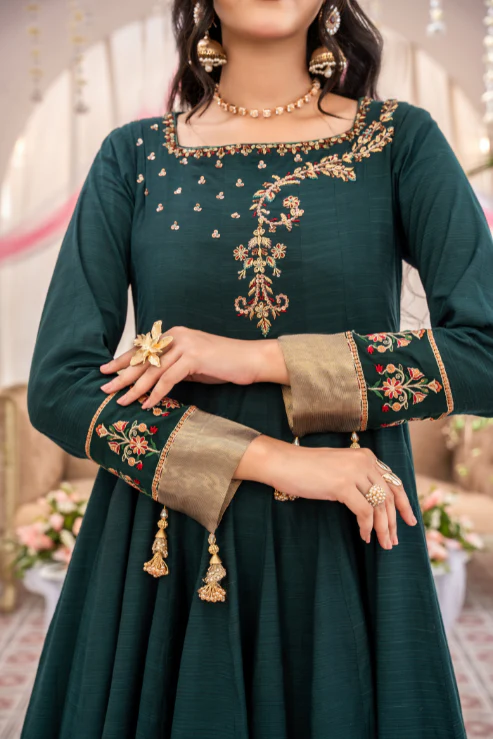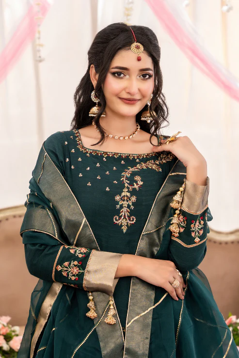 A bottle green cotton silk frock adorned with intricate handwork in kora, dabka, and resham. From embroidered hems to tassled sleeves and a dreamy organza dupatta with gota and lama detailing — every element celebrates your festive spirit.
