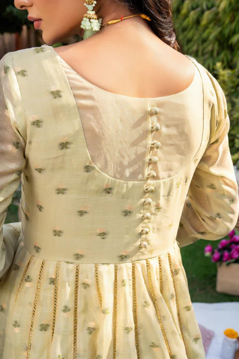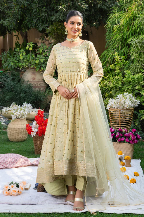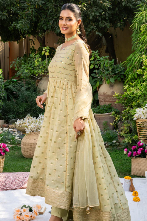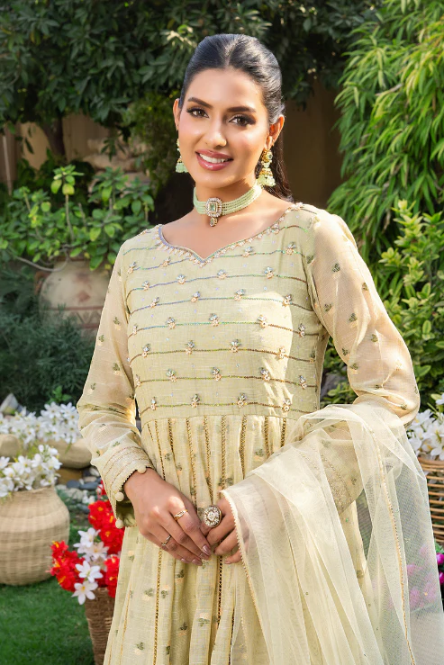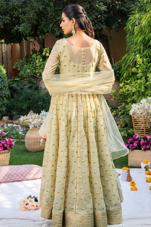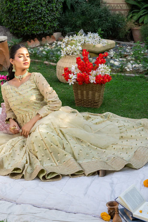 Drape yourself in the ethereal charm of Reena. A pista yellow Khaddi net pishwas that exudes effortless grace. Paired with a delicate Khaddi net dupatta, this ensemble is a timeless celebration of elegance.