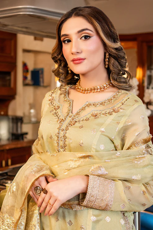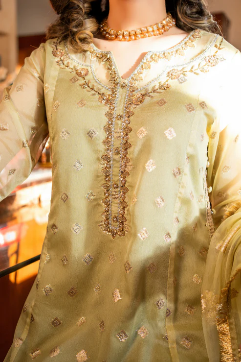 Drape yourself in the ethereal charm of Safana, a pista yellow chiffon airline shirt adorned with intricate handwork on the neckline featuring kora, dabka, and sequins. Paired with a raw silk dhaka highlighted by gota lace and a self-organza dupatta with crushed fringes lace, this ensemble is pure elegance in motion!