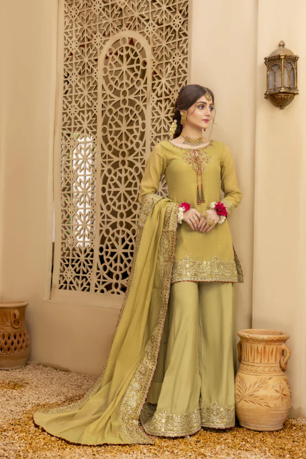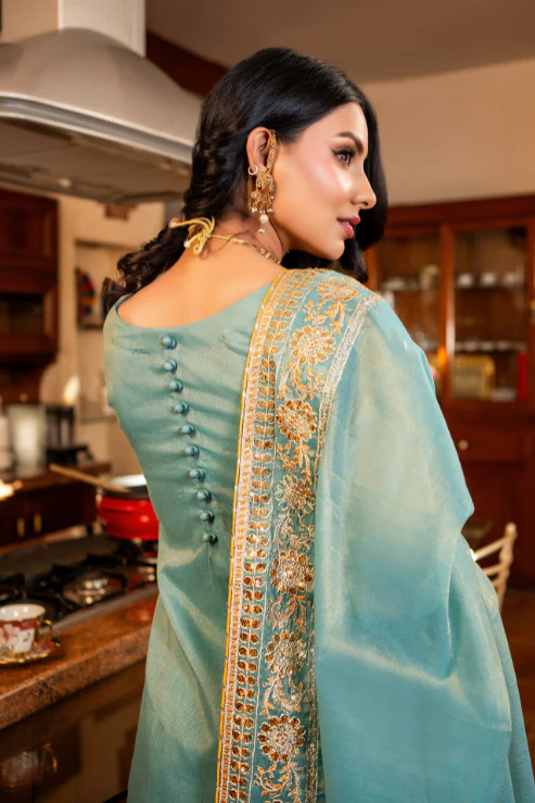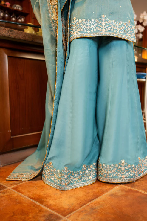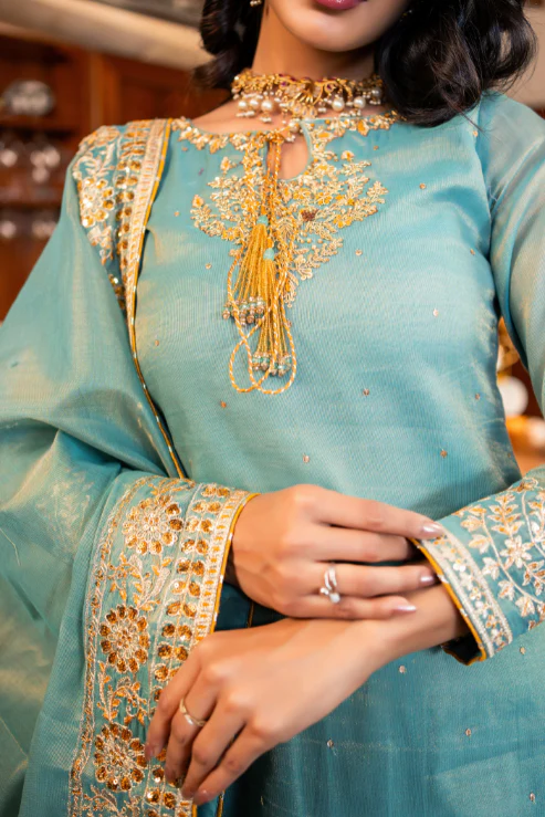 This graceful 3 piece Masuri ensemble features intricate handwork on the front with Kora, Dabca, Zardozi, and sequins, complemented by a tassel-adorned neck dori. Embroidery graces the daaman, sleeves, and Dhaka pants, while the Masuri dupatta boasts double-sided embroidery, making it perfect for any special occasion.