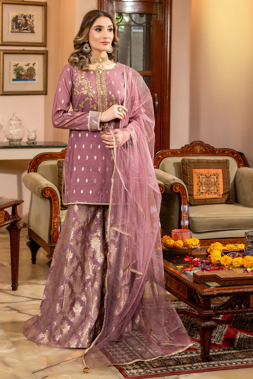 Meet Urwa, a dreamy tea pink ensemble designed to captivate. Featuring a beautifully tailored shirt paired with a flowy gharara, this 3-piece set is the perfect blend of tradition and sophistication. Soft, elegant, and effortlessly timeless!
