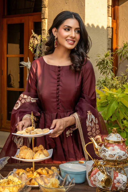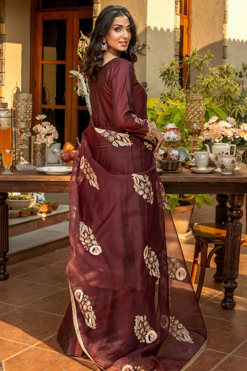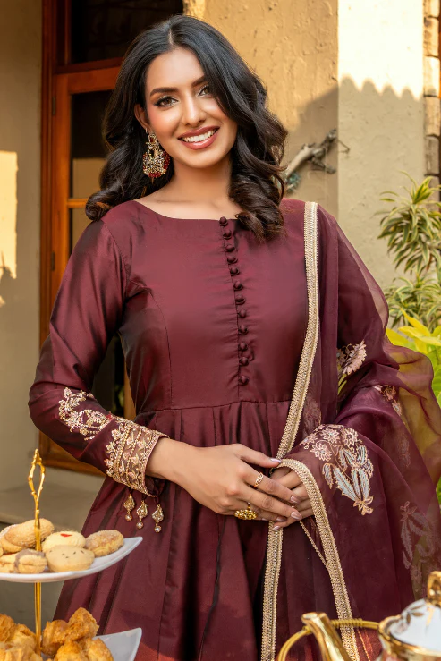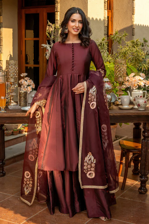 Drape yourself in luxury with Washa, a breathtaking maroon katan silk frock adorned with handworked sleeves featuring dabka, resham, and sequins with delicate tassels. Paired with a gota lace-detailed dhaka and an organza dupatta with block print, this ensemble is a perfect blend of heritage and sophistication.