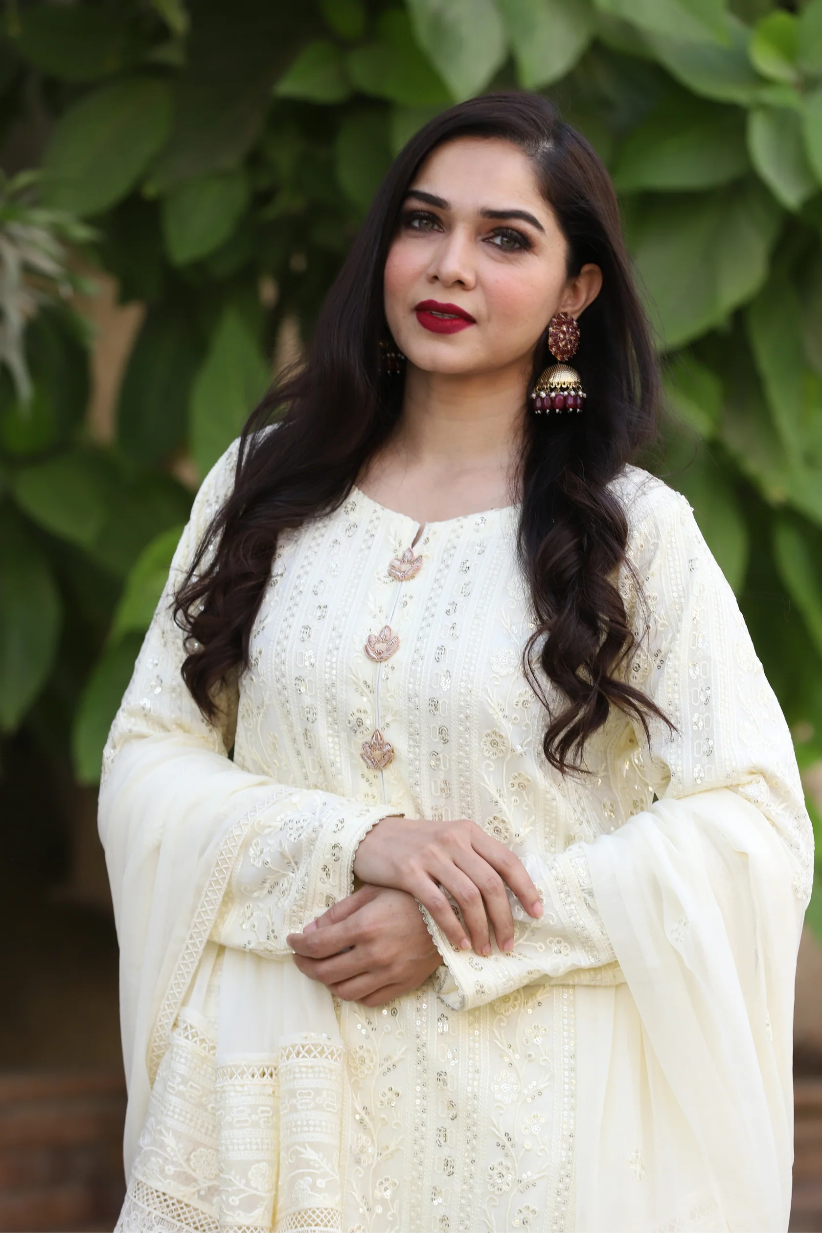 2. Intricate chicken kari embroidery with sequence and thread detailing.