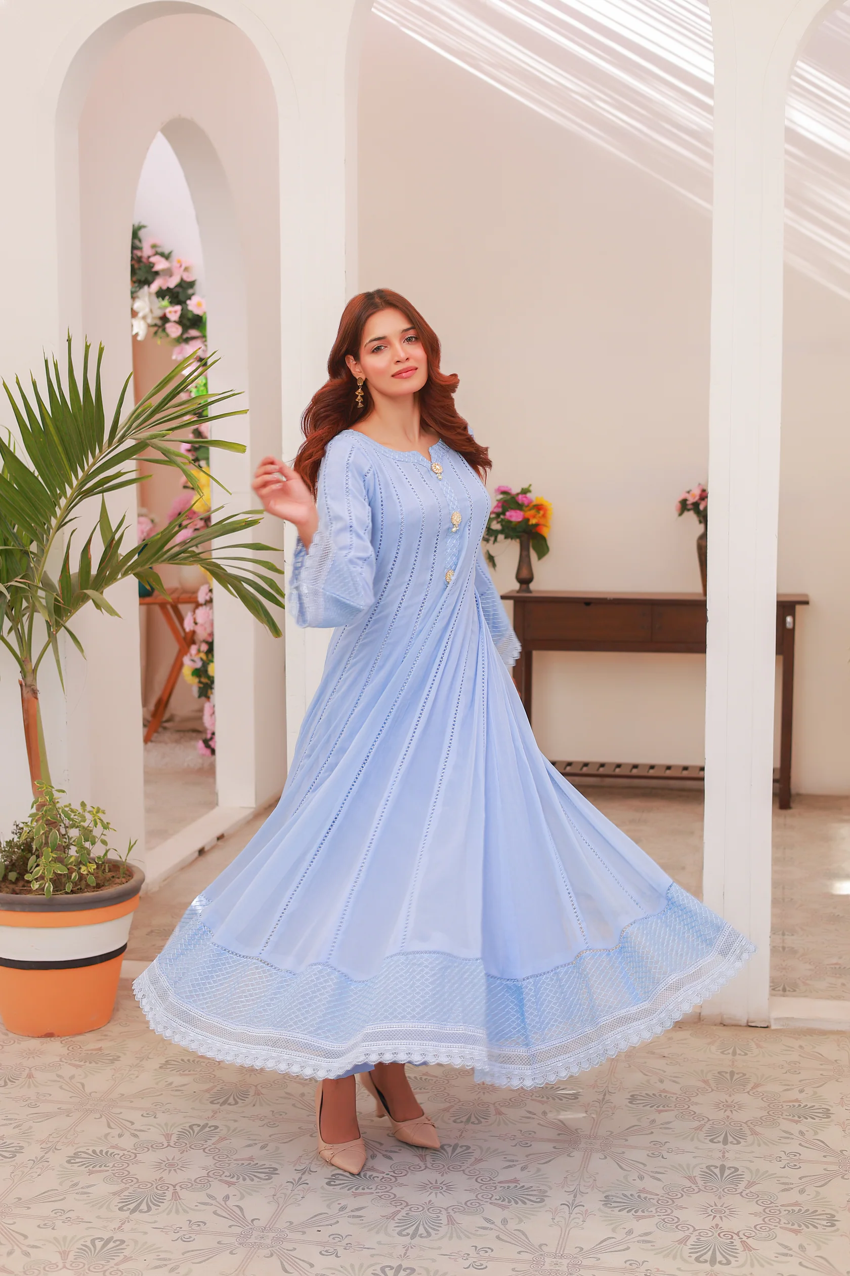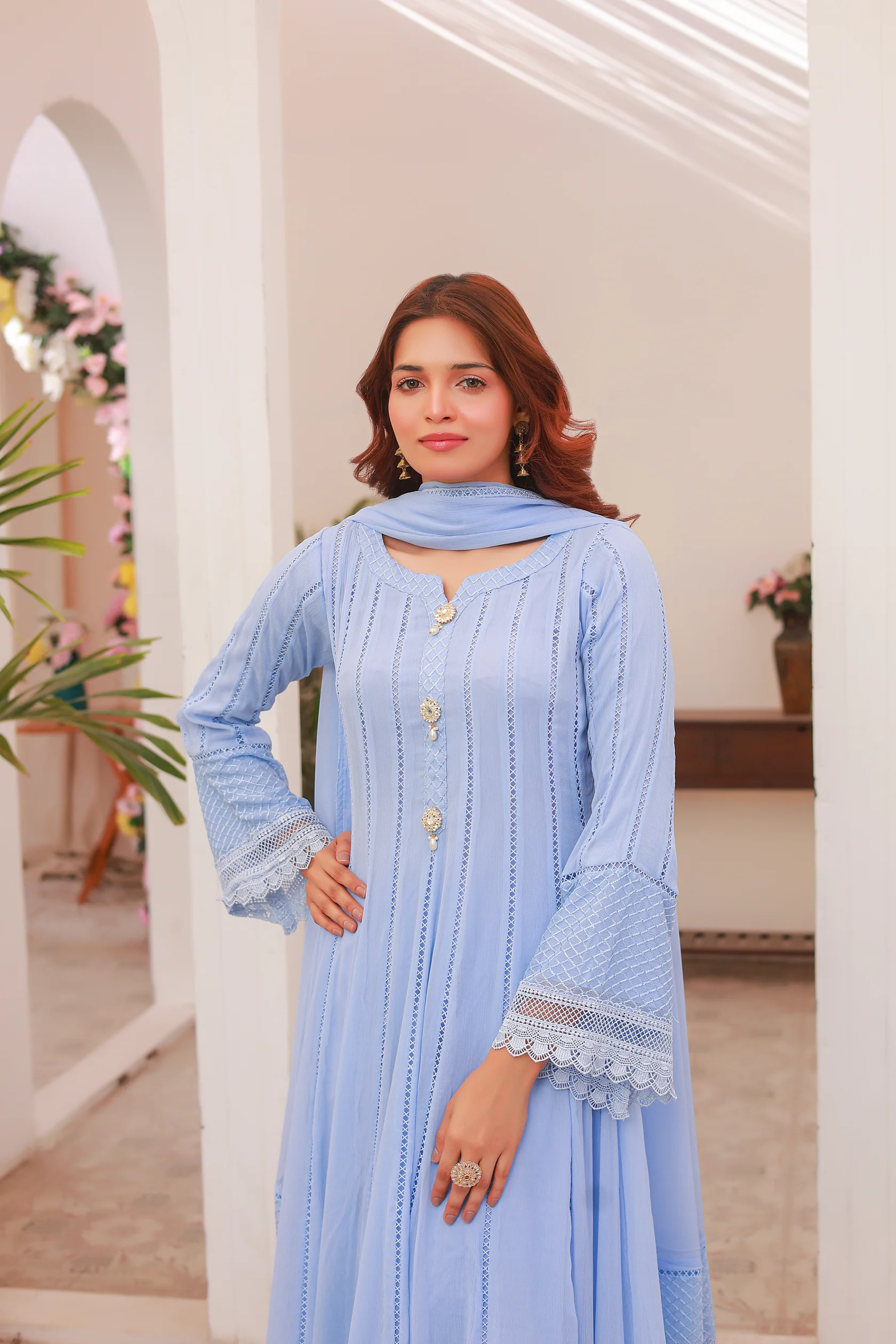 Indulge in luxury with our JC-102 chiffon maxi. Delicately crafted with elegant lace accents, this stunning piece exudes sophistication. Complete with straight pants and a chiffon dupatta, this outfit is perfect for any lavish occasion. Elevate your wardrobe with this must-have ensemble.