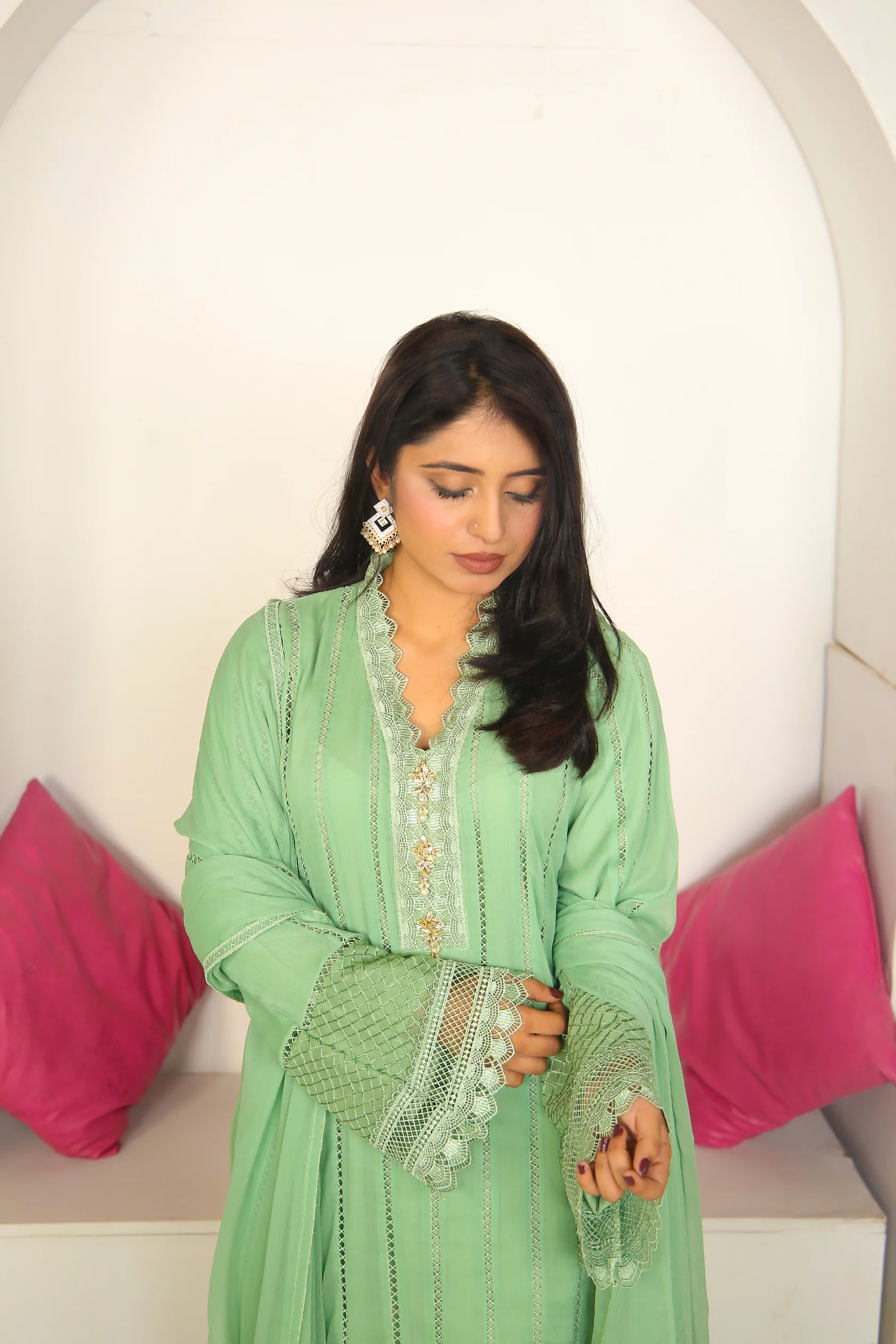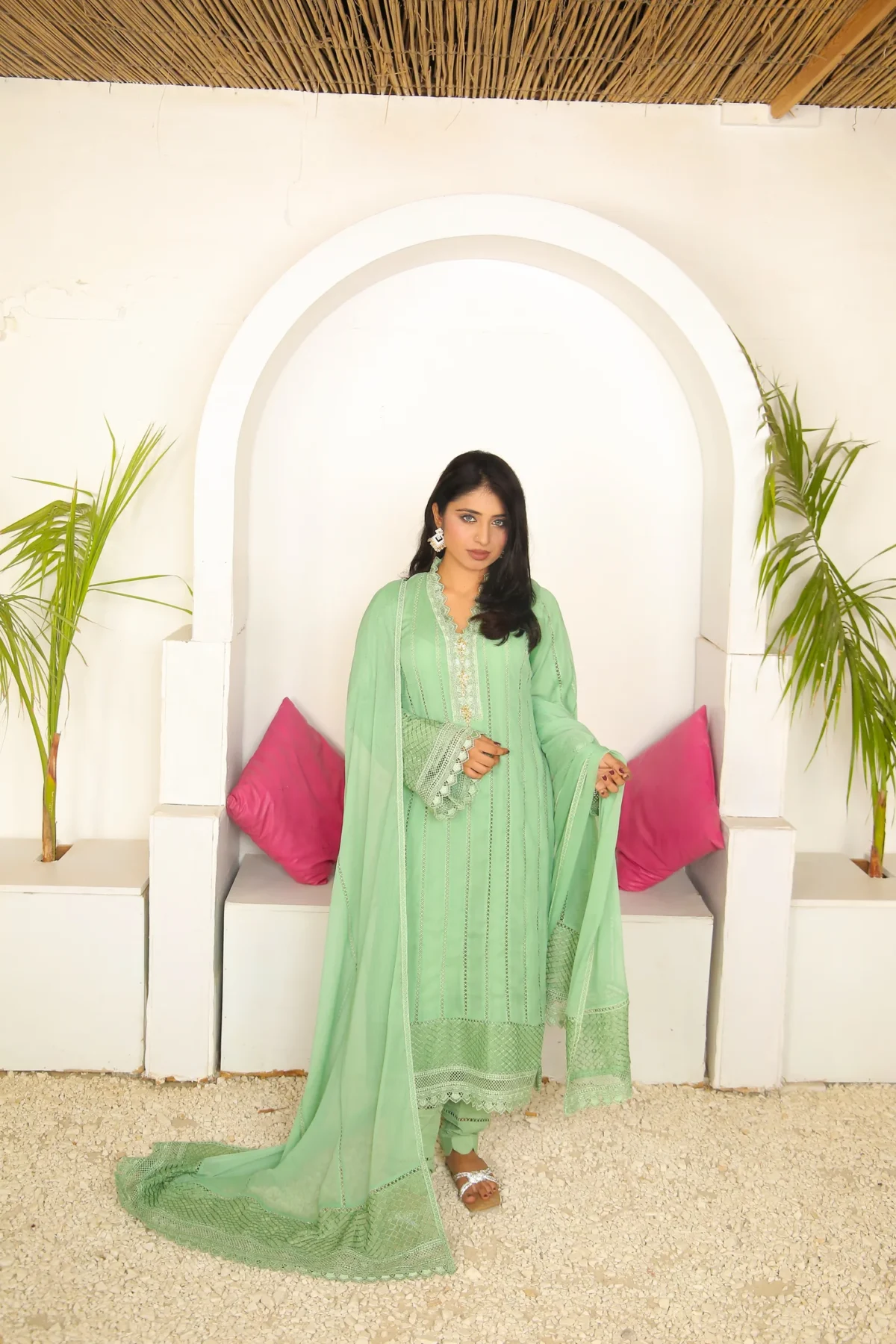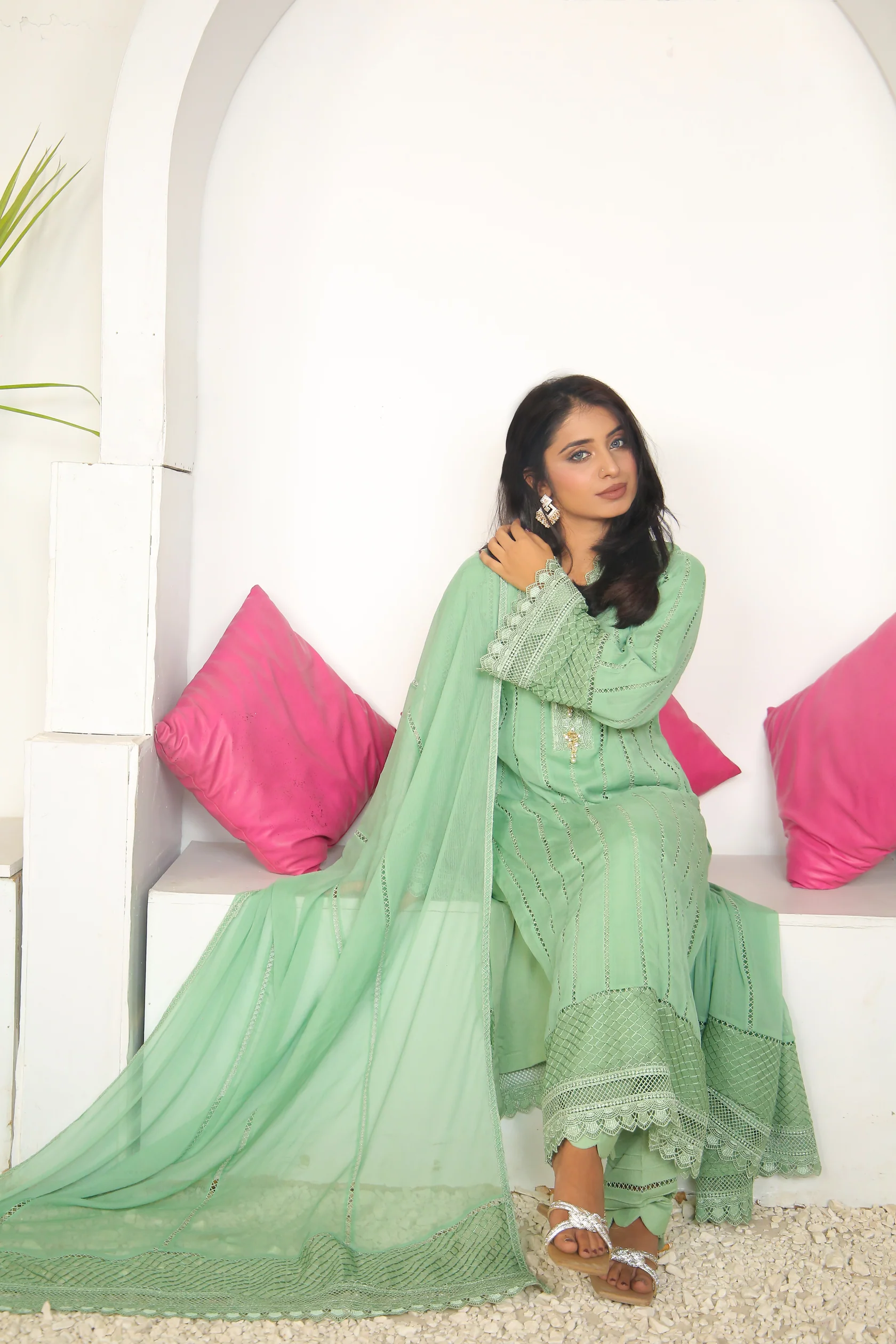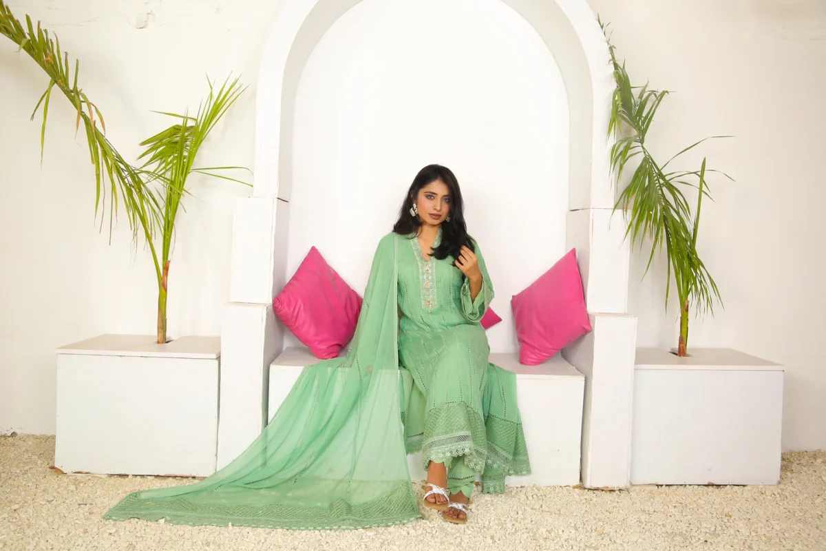 Elevate your wardrobe with this stunning chiffon dress, designed to offer both comfort and sophistication. The soft, lightweight fabric drapes beautifully, providing a graceful flow that moves effortlessly with you. The delicate lace details add a touch of femininity and elegance, enhancing the overall design. Perfect for both casual and semi-formal occasions, this dress will make you feel chic and confident. Whether you’re attending a wedding, a cocktail party, or a special evening out, the combination of chiffon and lace ensures you stand out in style.