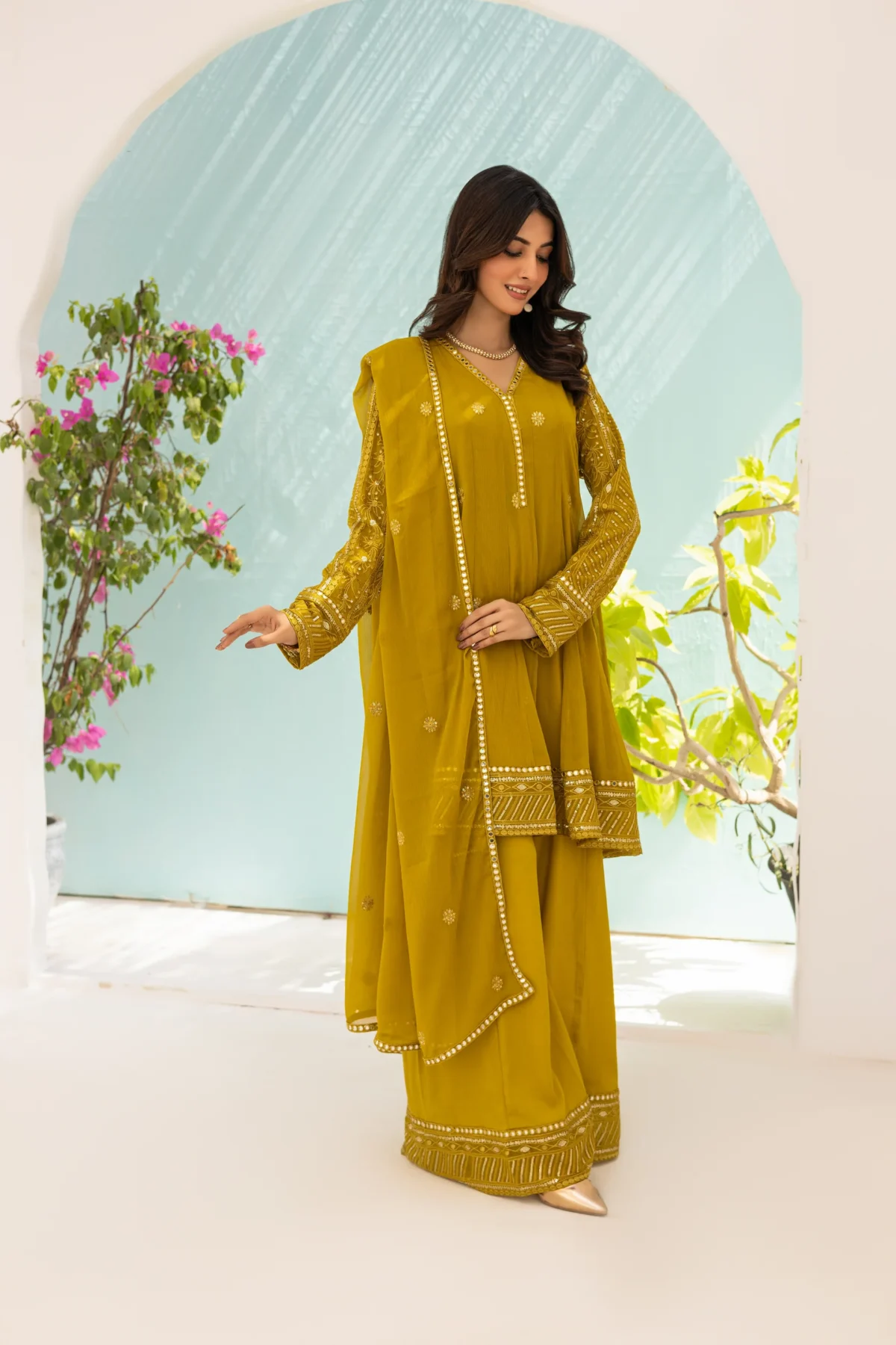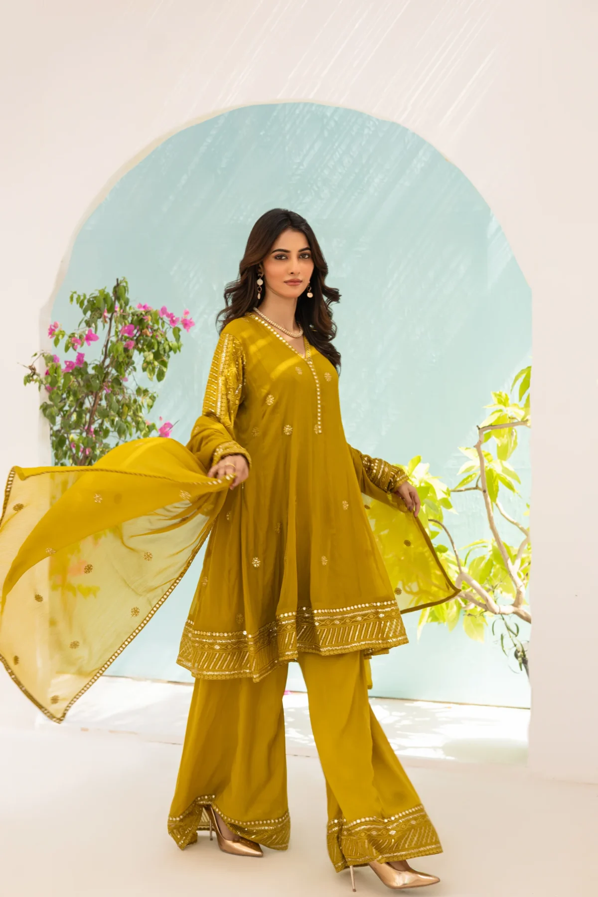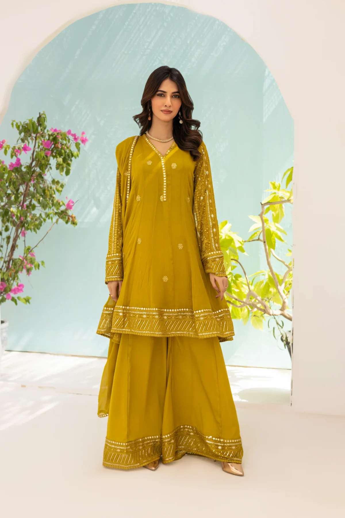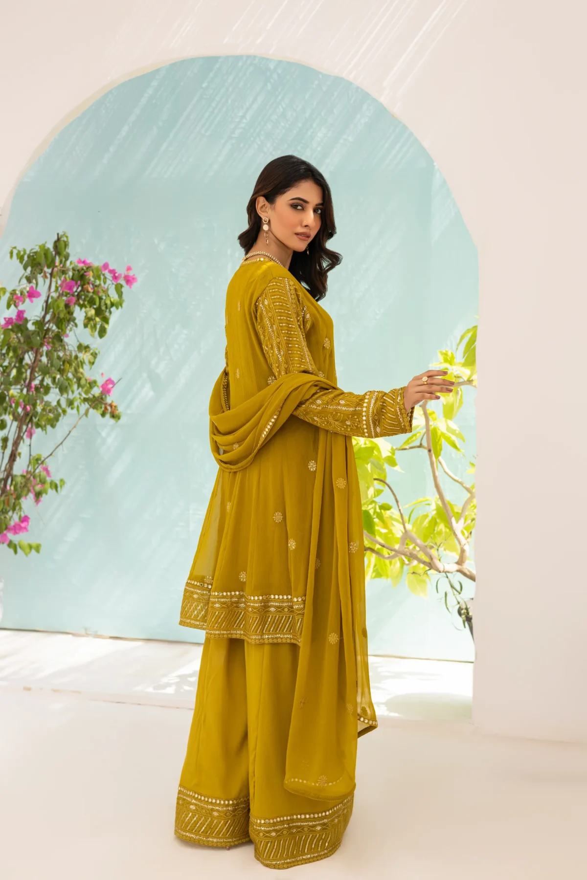 Elevate your style with this stunning olive green chiffon peplum featuring exquisite resham and sequin embroidered sleeves and border. The intricate detailing adds a touch of elegance and glamour to the outfit. Complete your look with a beautiful chiffon dupatta and a matching plazo.