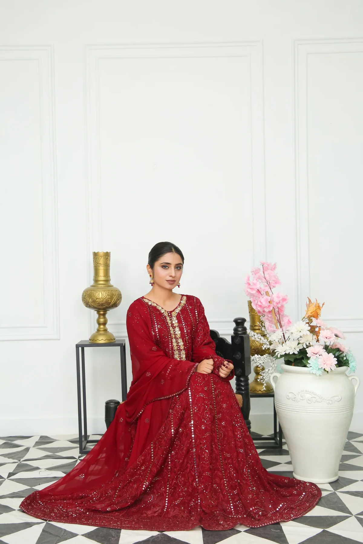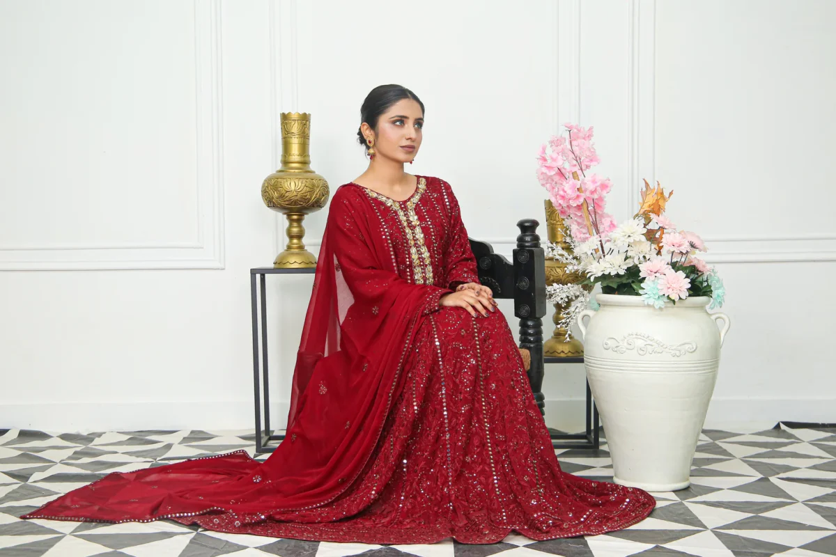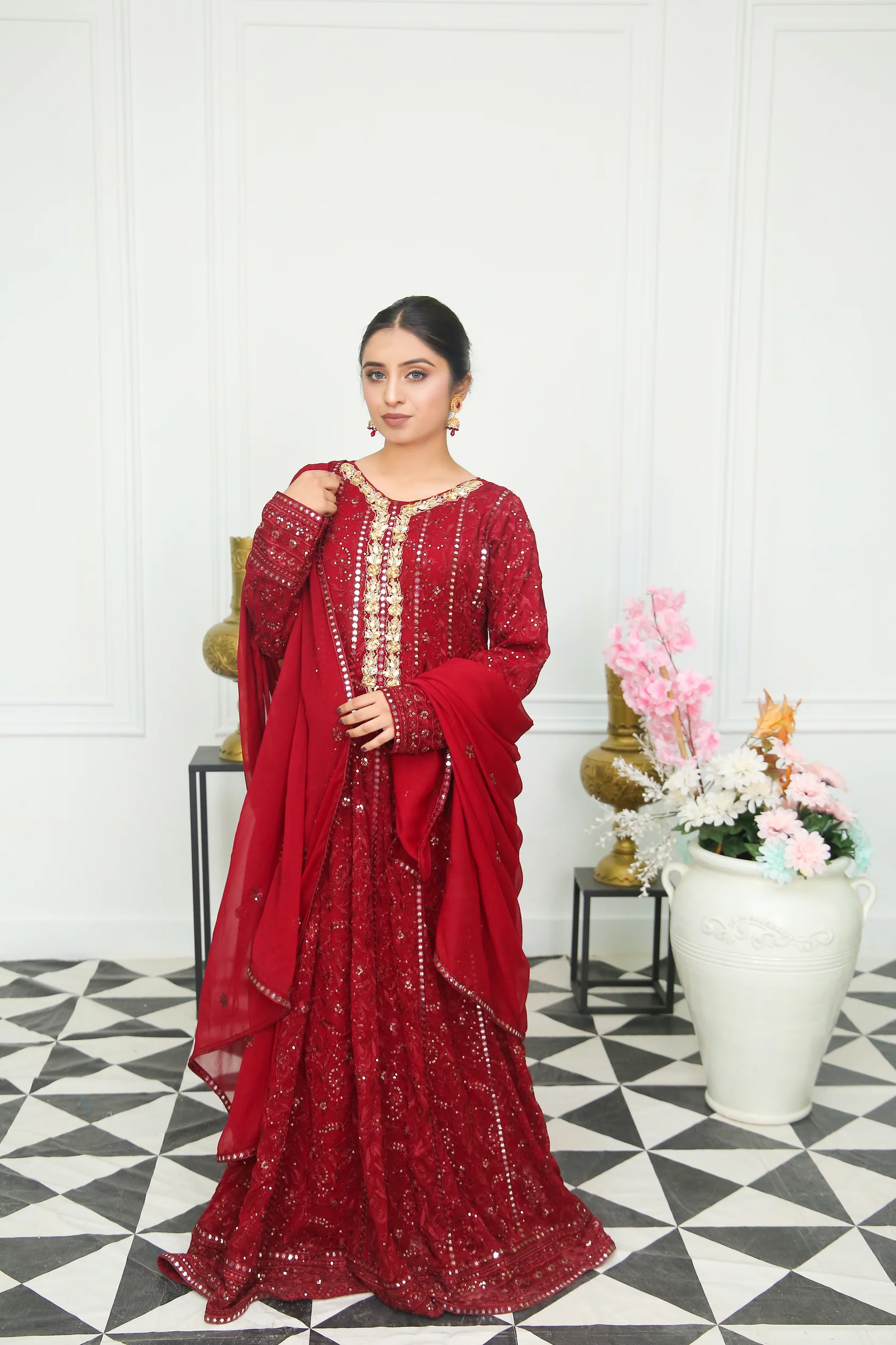 This beautiful dress is a masterpiece of craftsmanship, featuring intricate thread work and exquisite sequin embroidery. The design showcases both 3mm and 9mm sequins, carefully stitched to create a sparkling, eye-catching effect that enhances the garment’s overall elegance. The neckline is a true work of art, entirely hand-crafted with delicate gota work, adding a regal touch to the look. Perfect for weddings, festive occasions, or any event where you want to make a statement, this dress combines traditional techniques with a modern twist for a timeless, luxurious feel.
