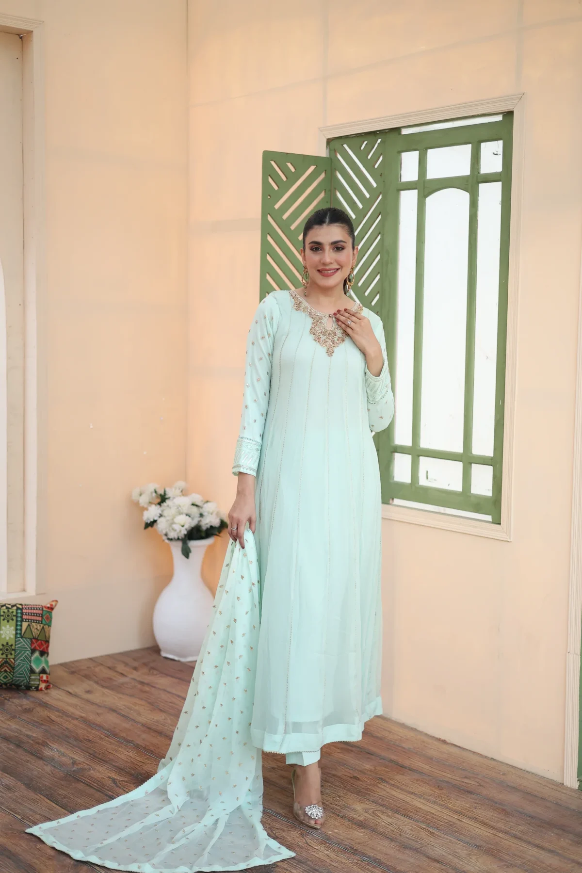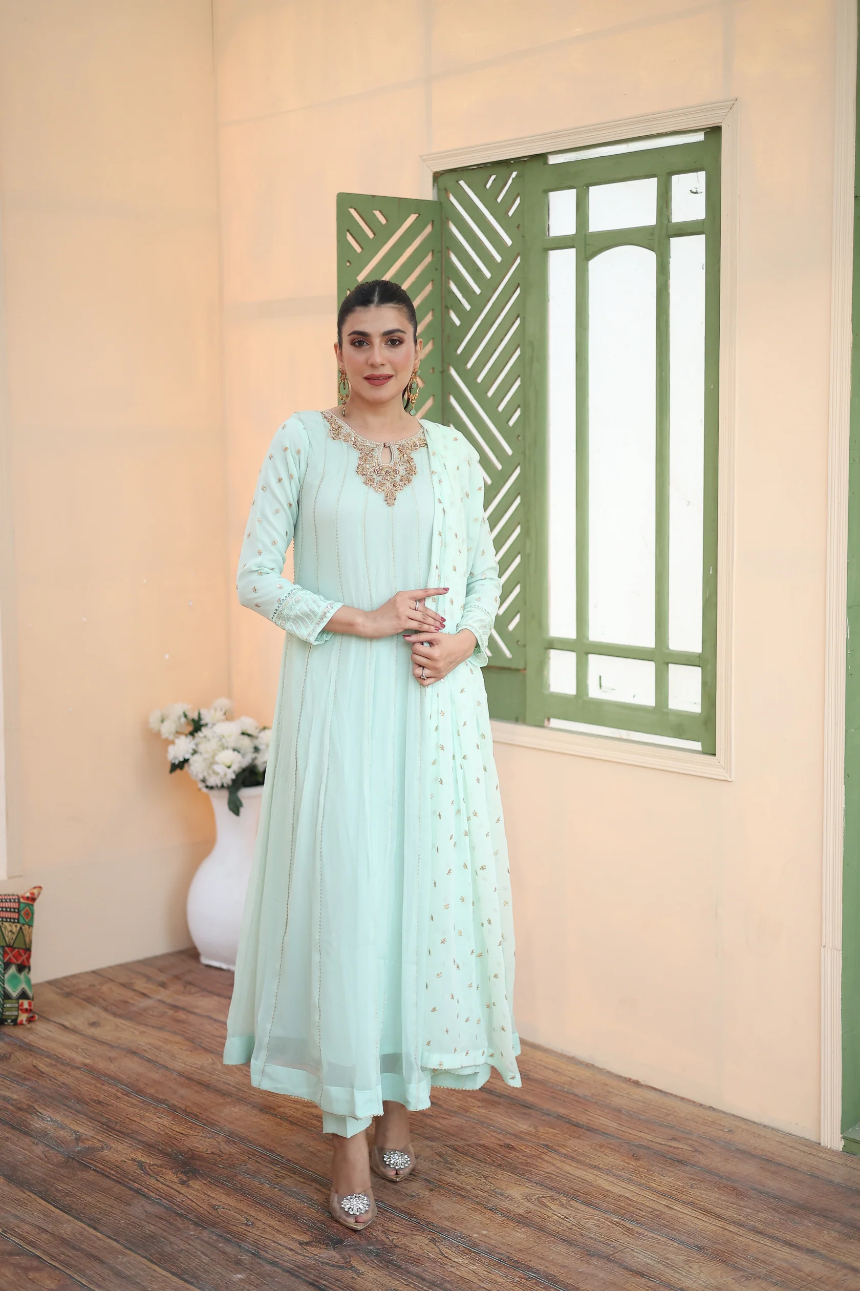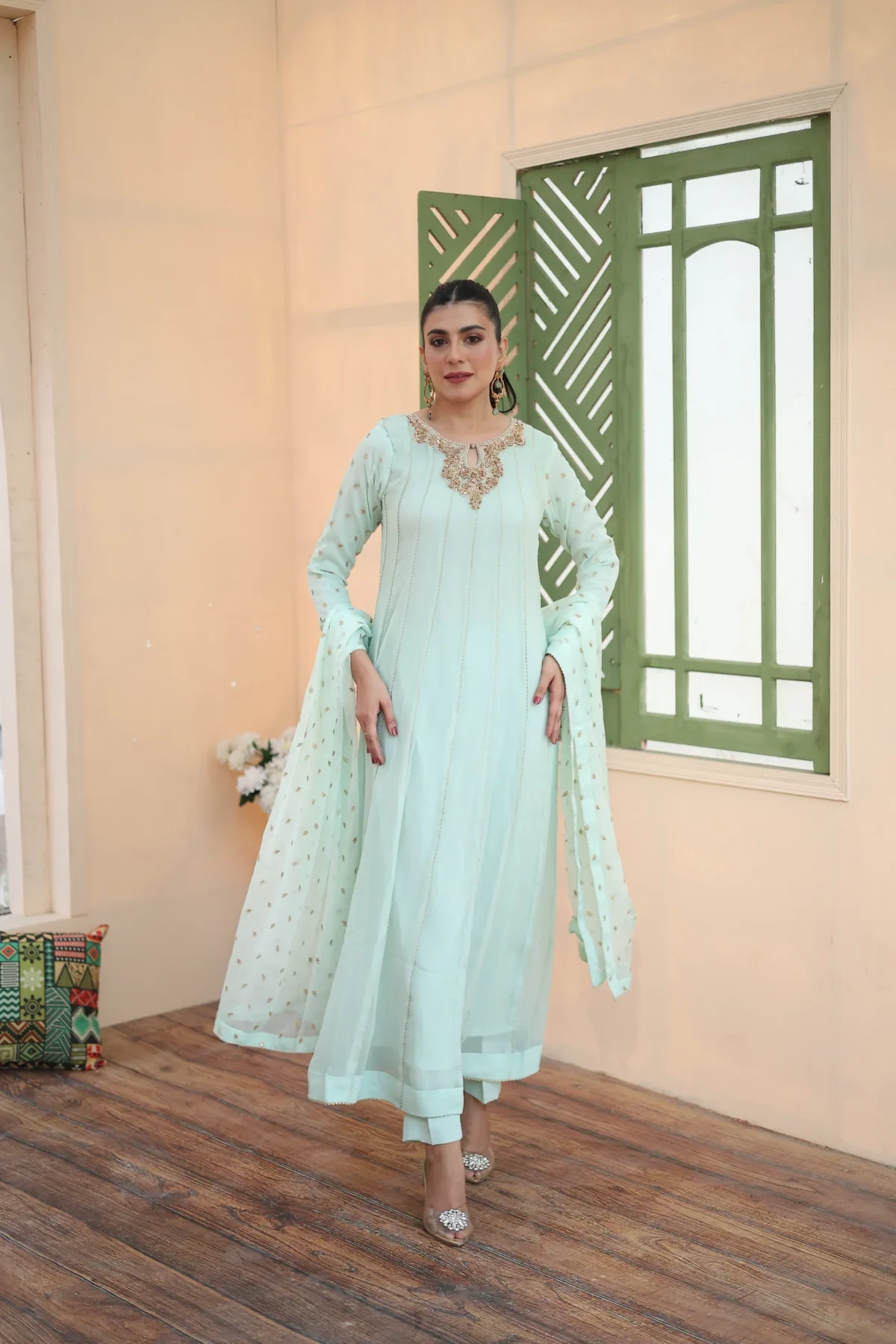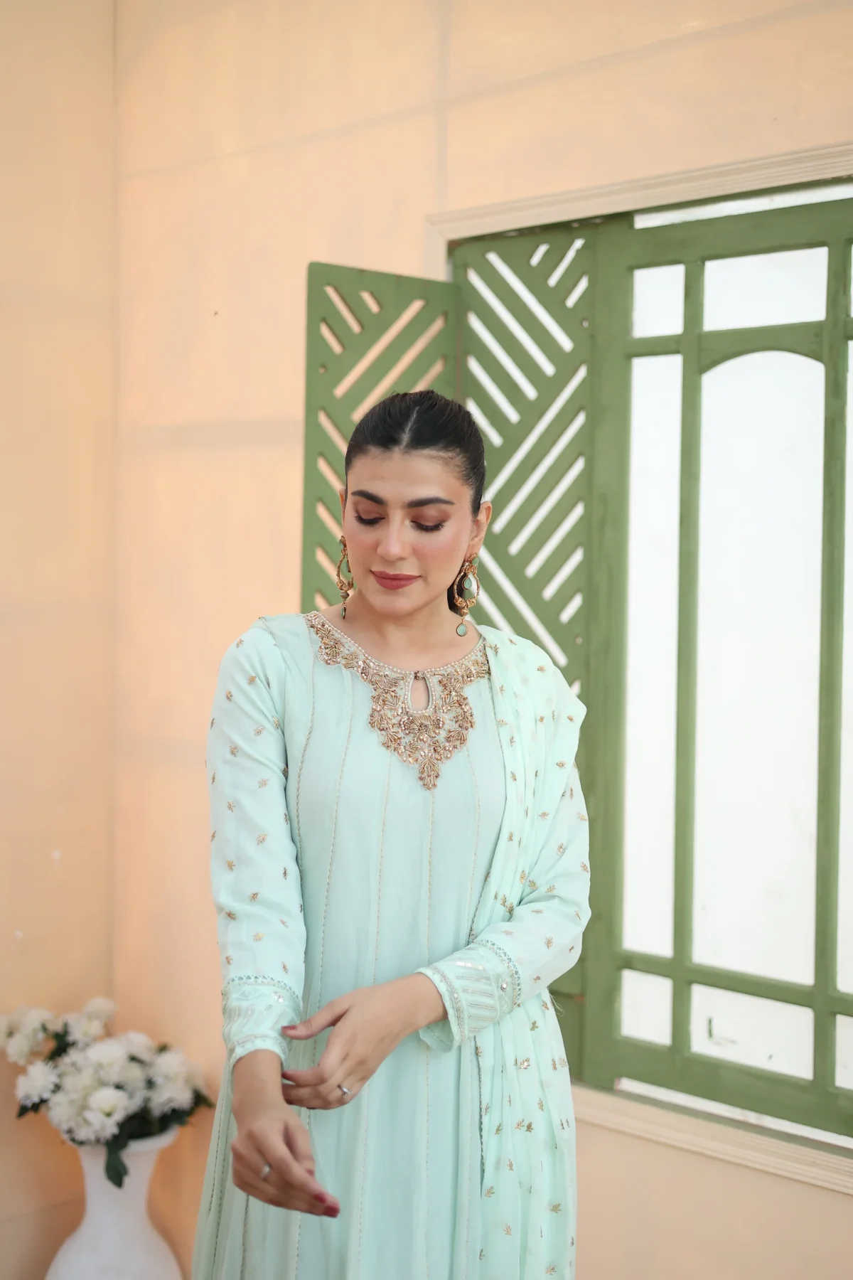 Elevate your wardrobe with our stunning shiffon anarkali maxi. This hand-embroidered piece features intricate zari boti sleeves and a beautiful hydarabadi neck, accompanied by a matching dupatta and straight pants. Add a touch of elegance to any occasion with this timeless ensemble.