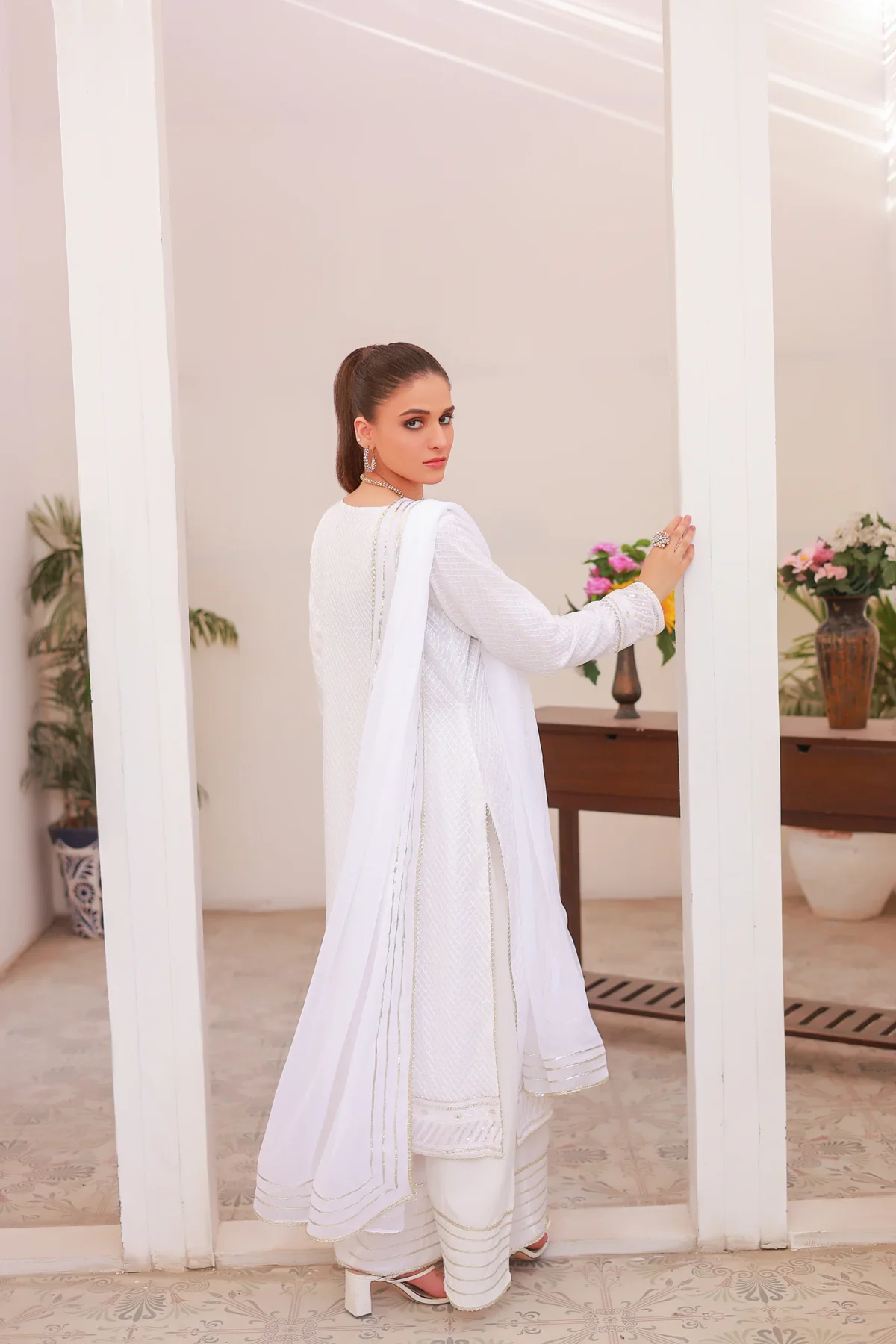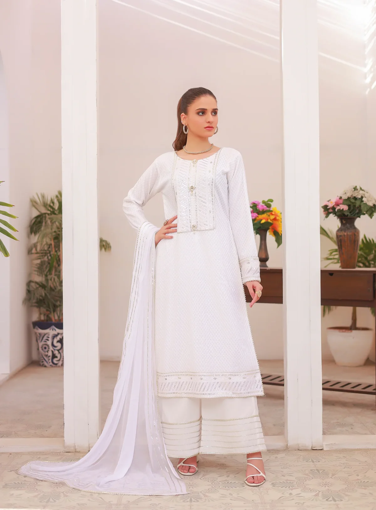 Elevate your style with our luxurious JC-208ST set. Crafted from white chiffon and adorned with delicate sequin embroidery, this shirt exudes elegance. Paired with flared pants and a chiffon dupatta, it’s the perfect ensemble for any sophisticated occasion. Embrace the opulence of our chiffon thread and sequin shirt and elevate your wardrobe to new heights.
