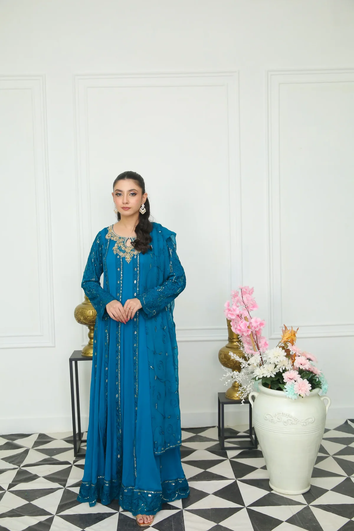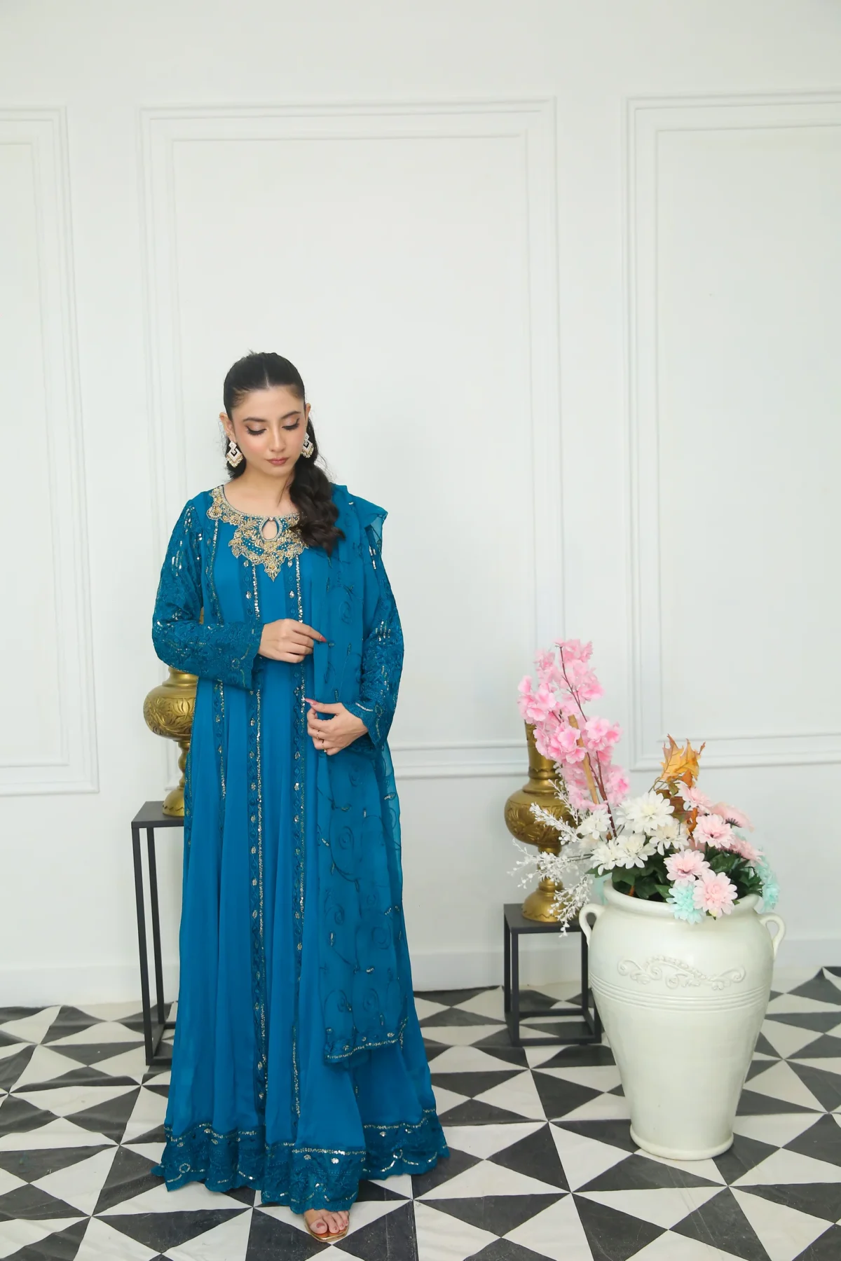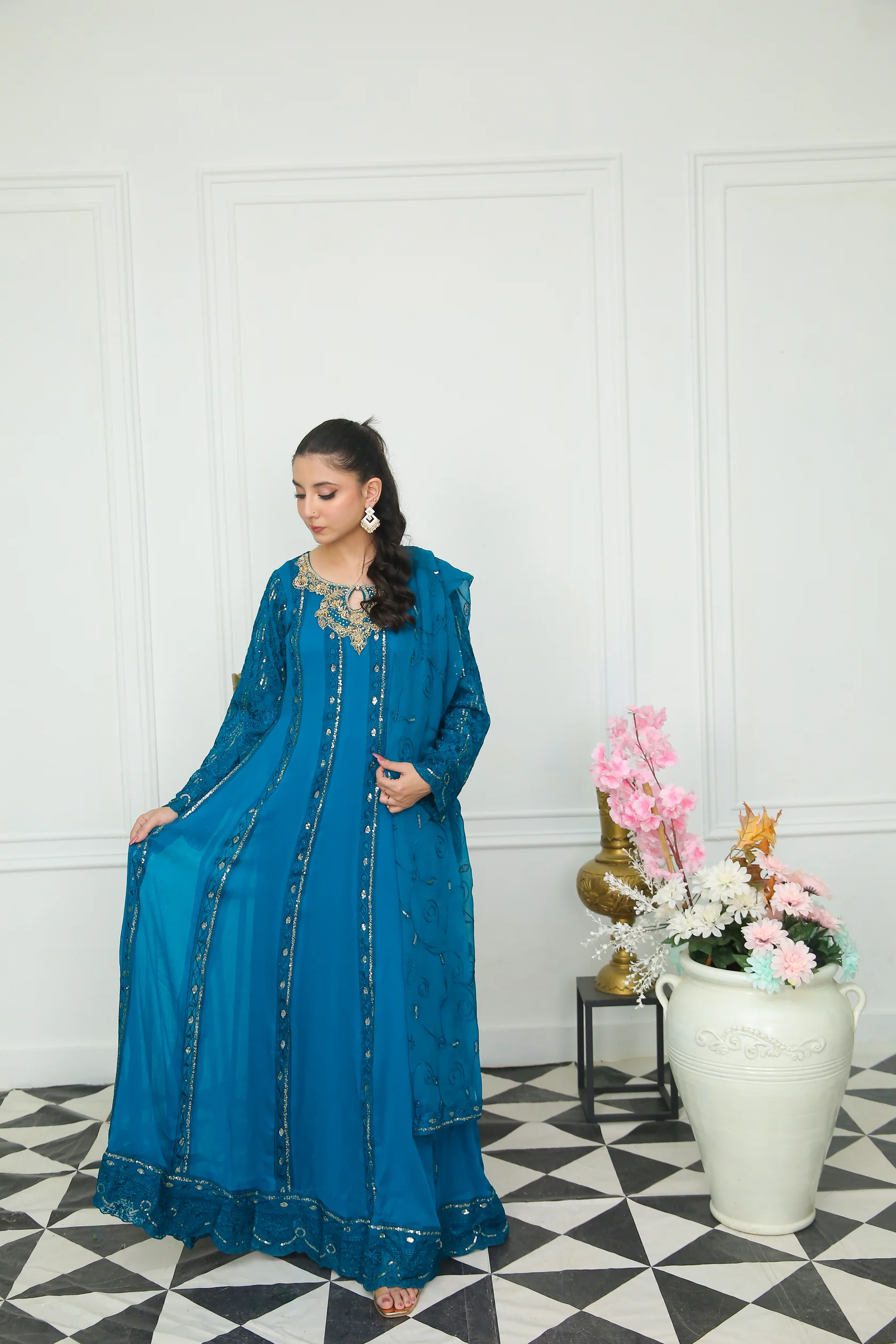 This exquisite ensemble features a beautifully crafted chiffon dress with intricate thread embroidery and sparkling sequin detailing. The soft chiffon fabric drapes elegantly, while the handmade neckline adds a touch of artistry and sophistication. The set includes a stylish 3-piece design, complete with matching trousers for a modern, coordinated look. The inner lining is made from premium China Krab fabric, offering extra comfort and a smooth fit. Perfect for weddings, parties, or upscale events, this outfit is a blend of luxury, tradition, and contemporary style.