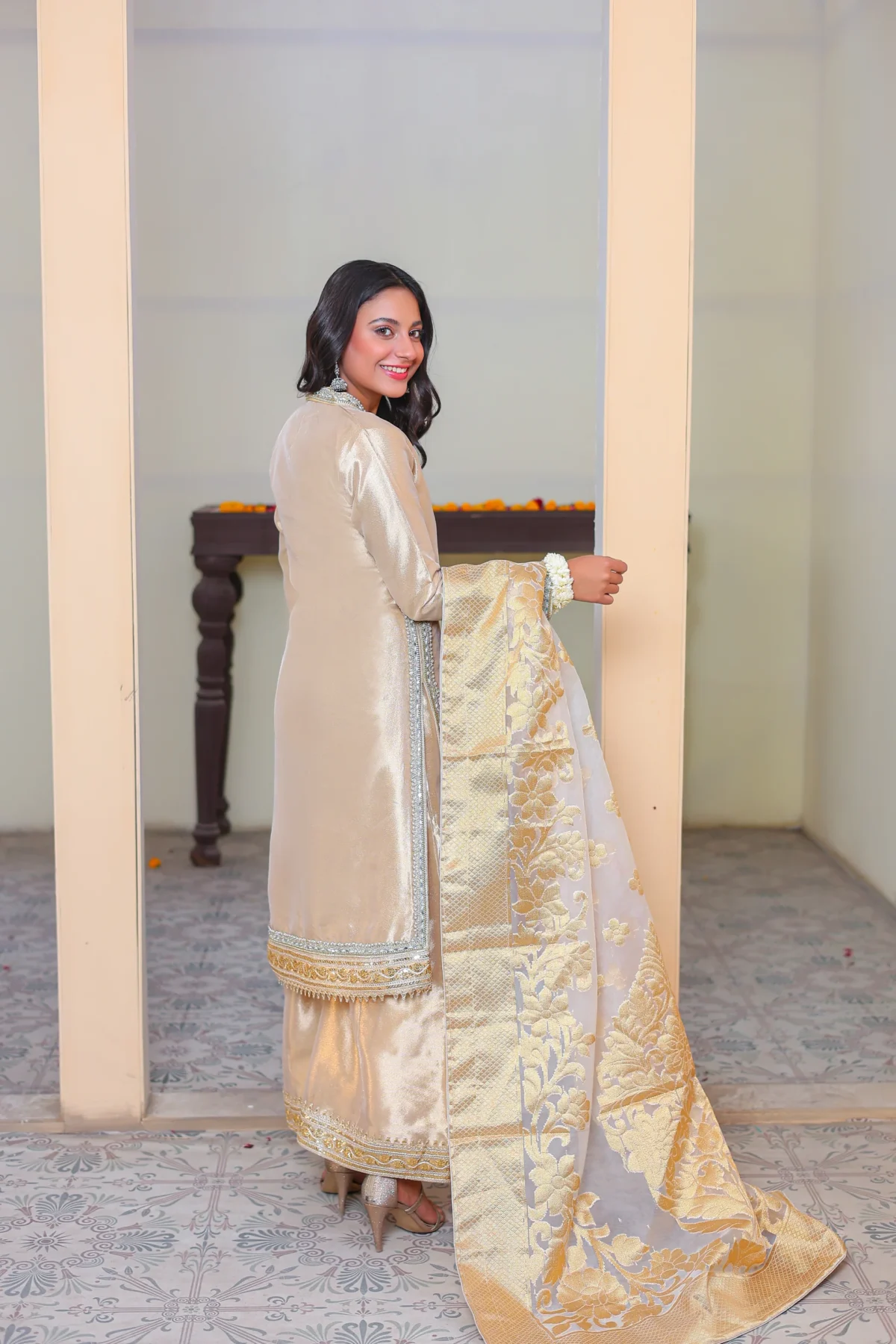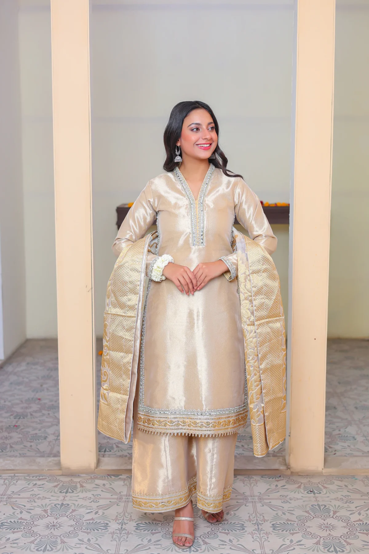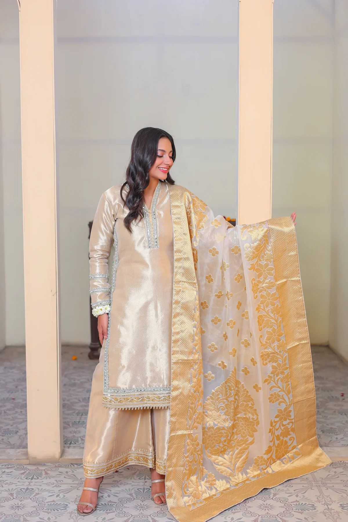 Indulge in luxury with our JC-LTST ensemble. This exquisite lama tissue shirt boasts beautiful mirror and pearl lace detailing, paired with stylish dhaka pants and a stunning banarsi organza dupatta. Elevate your wardrobe with this sophisticated and exclusive piece.