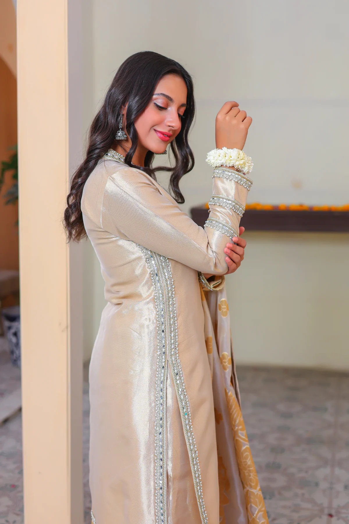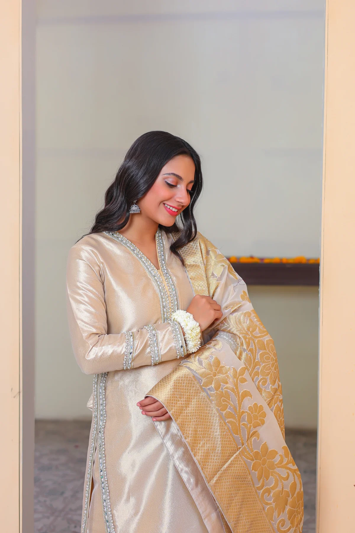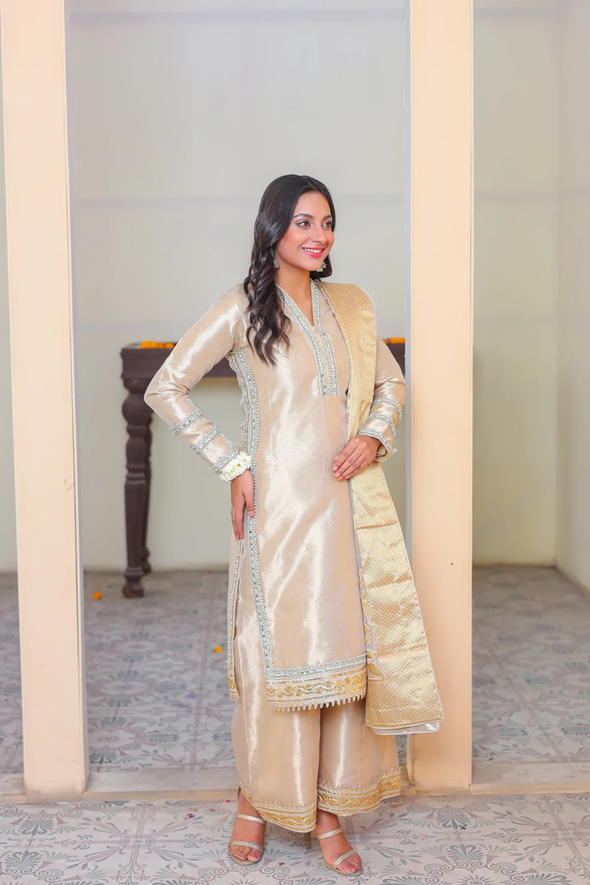 Indulge in luxury with our JC-LTST ensemble. This exquisite lama tissue shirt boasts beautiful mirror and pearl lace detailing, paired with stylish dhaka pants and a stunning banarsi organza dupatta. Elevate your wardrobe with this sophisticated and exclusive piece.