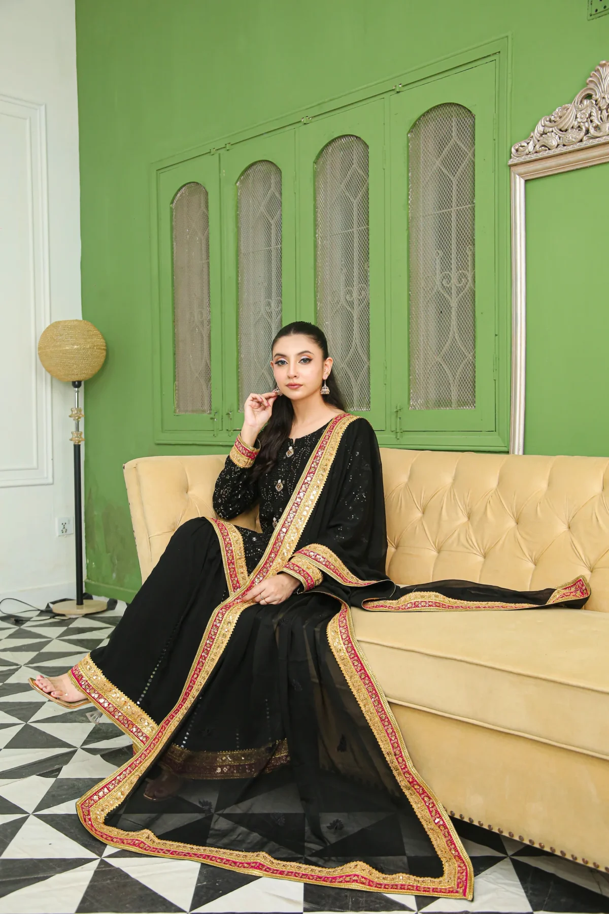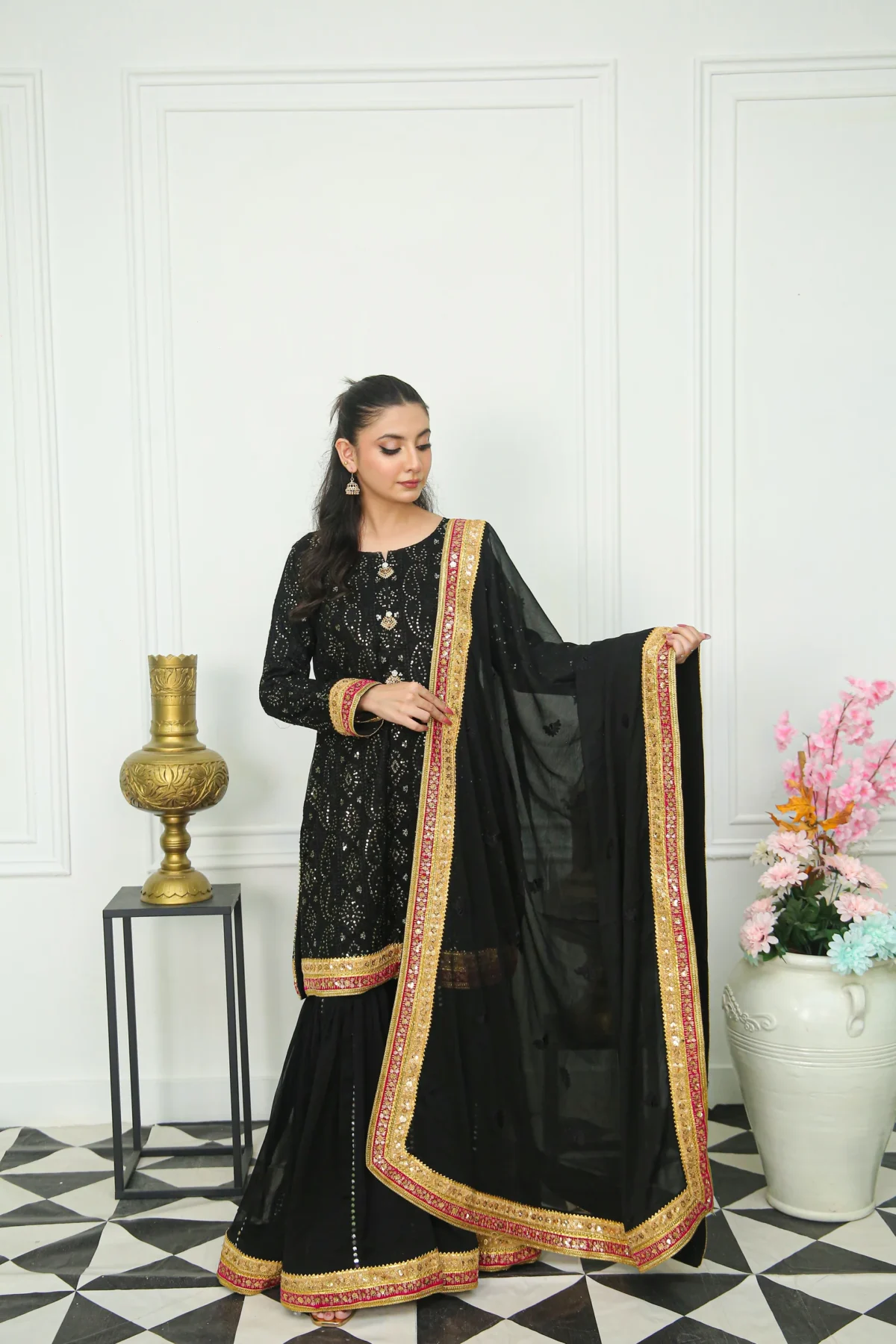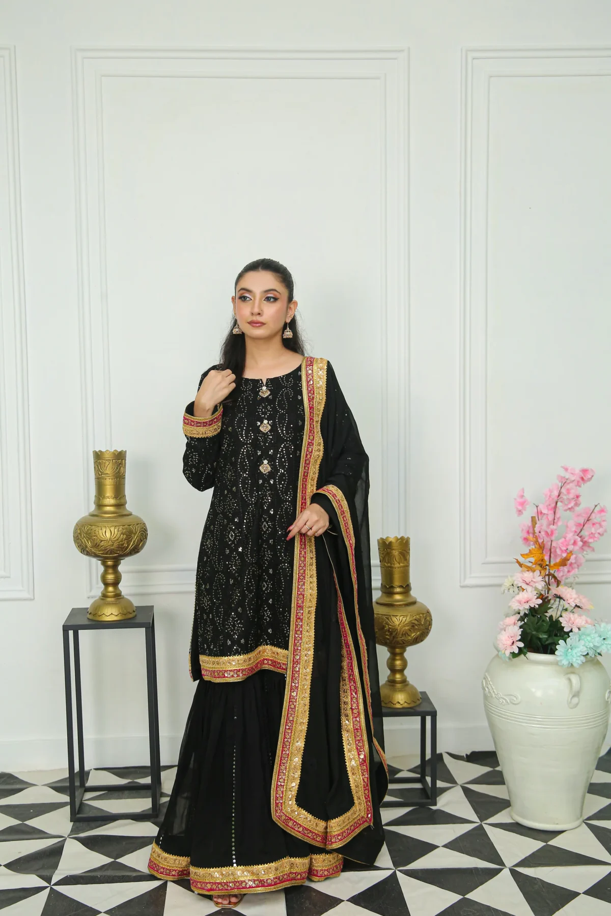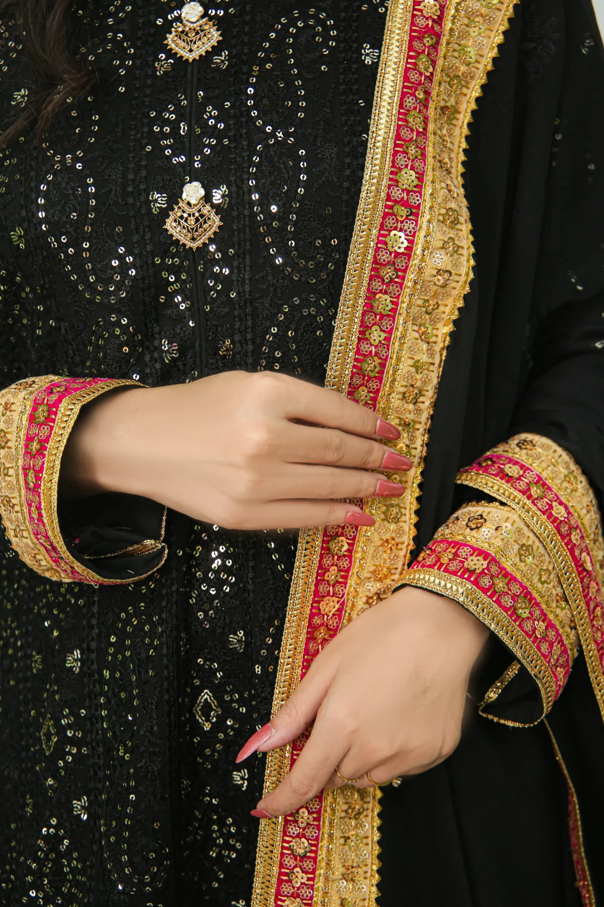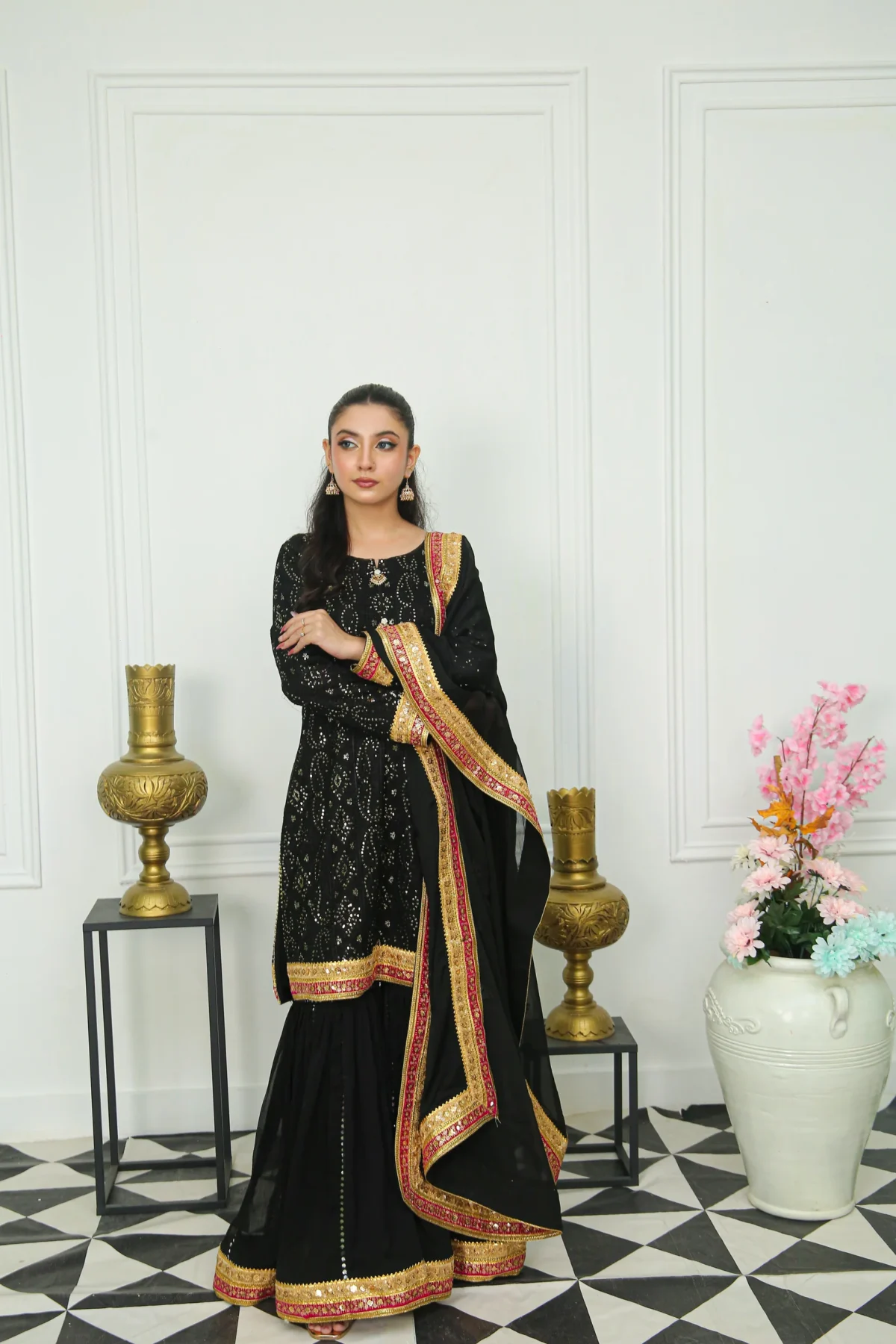 Chiffon Chicken Kari Dress with Thread & Sequence Embroidery, Indian Lace Details & Garara with 9mm Sequin Work