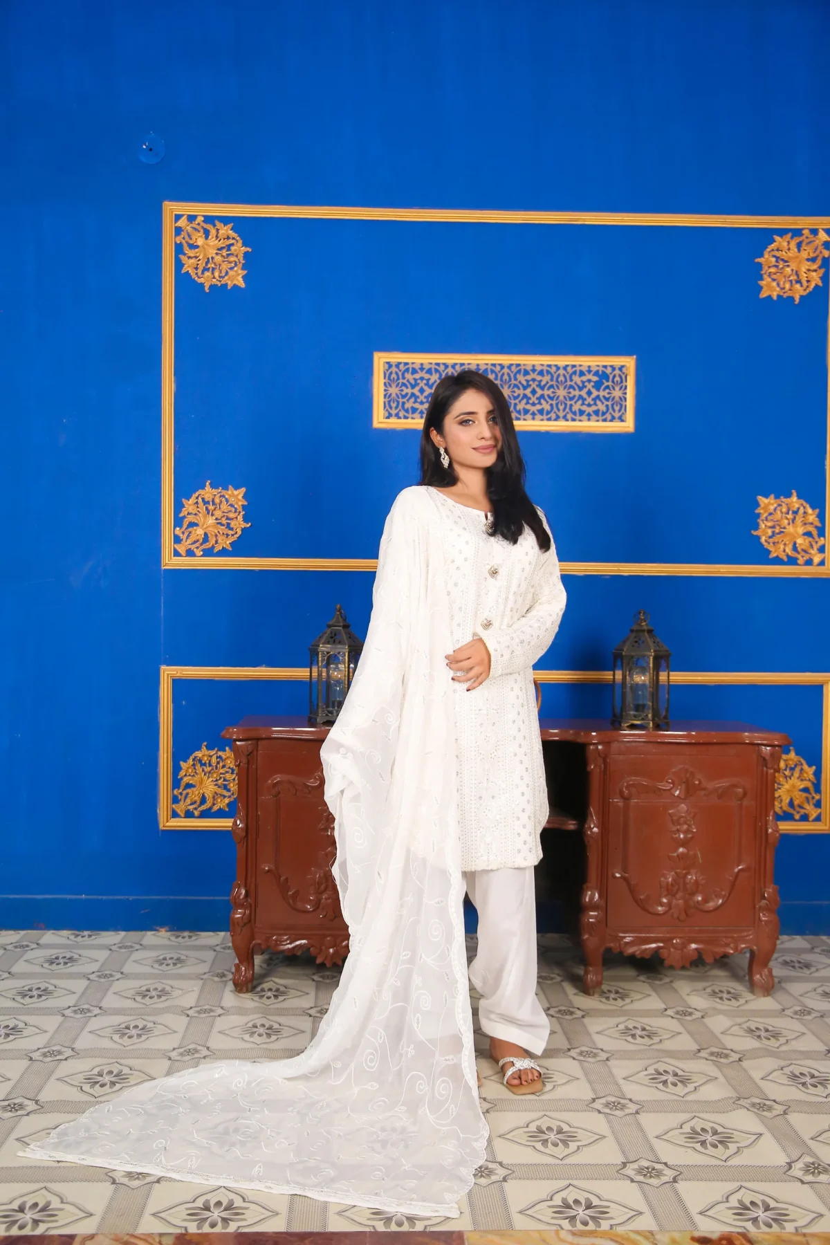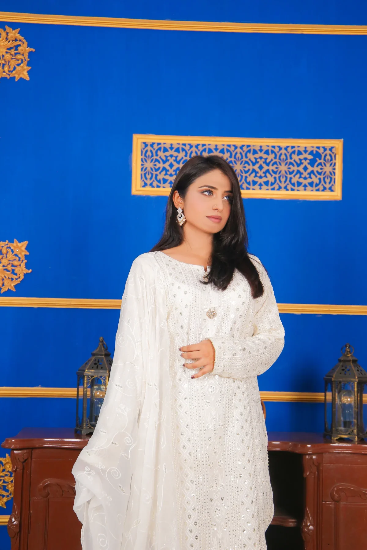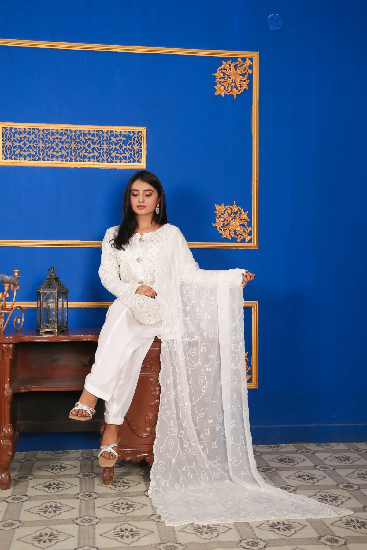 This stunning 3-piece set features a delicate chiffon shirt with intricate chicken kari work, beautifully complemented by sequence and thread embroidery for a touch of sparkle and texture. The soft, luxurious chiffon fabric drapes gracefully, ensuring comfort and elegance with every wear. The set includes a matching chiffon embroidered dupatta, which enhances the overall look with its detailed craftsmanship. Designed in timeless white, this ensemble exudes sophistication and is perfect for weddings, festive events, or any special occasion where you want to make a lasting impression.
