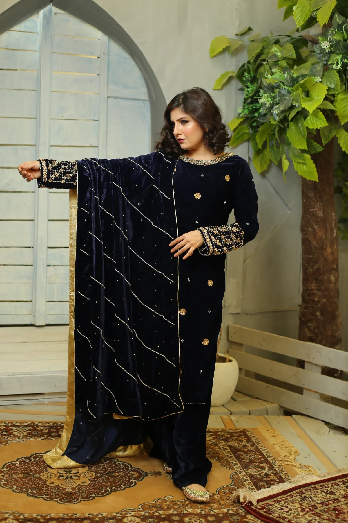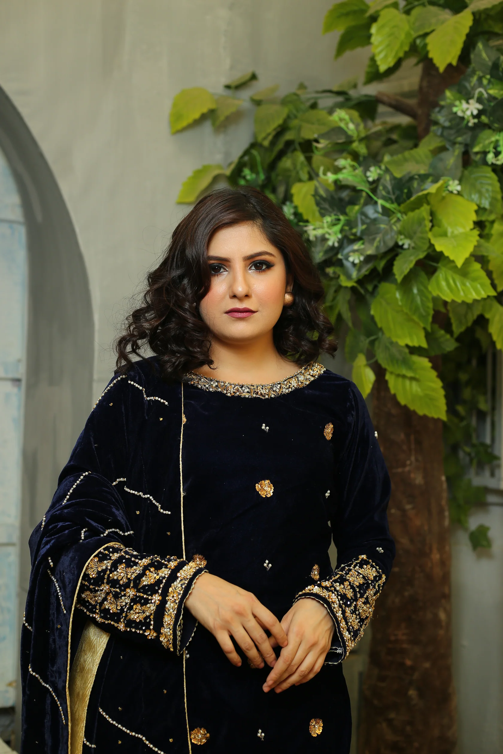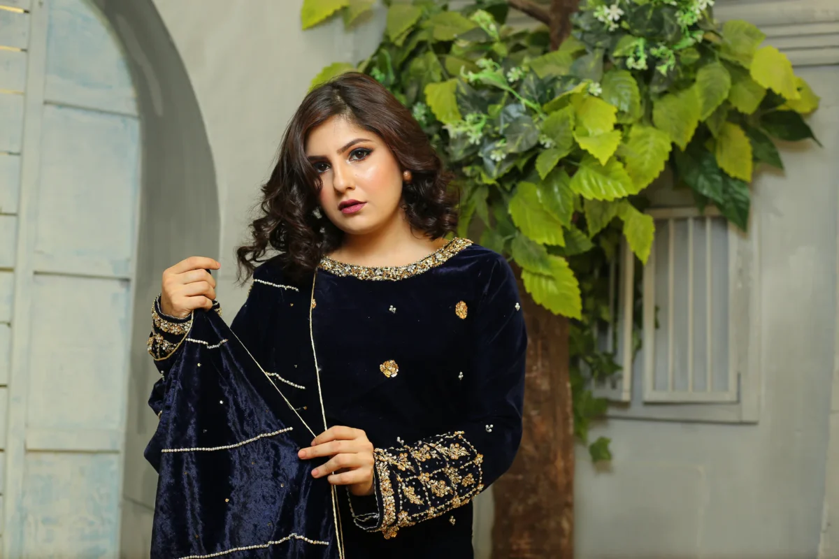 Indulge in the luxurious softness of 9000 micro velvet with this elegant 2-piece set. The shirt is meticulously crafted with complete handwork, showcasing exquisite embroidery that adds depth and sophistication to the rich velvet fabric. Paired with a beautifully embroidered velvet shawl, this ensemble radiates timeless beauty and elegance. Perfect for formal occasions, weddings, or festive celebrations, this set combines both comfort and style. The shawl, priced at PKR 20,000, completes the look with its intricate handwork, making this a must-have for those who appreciate high-quality craftsmanship and design.