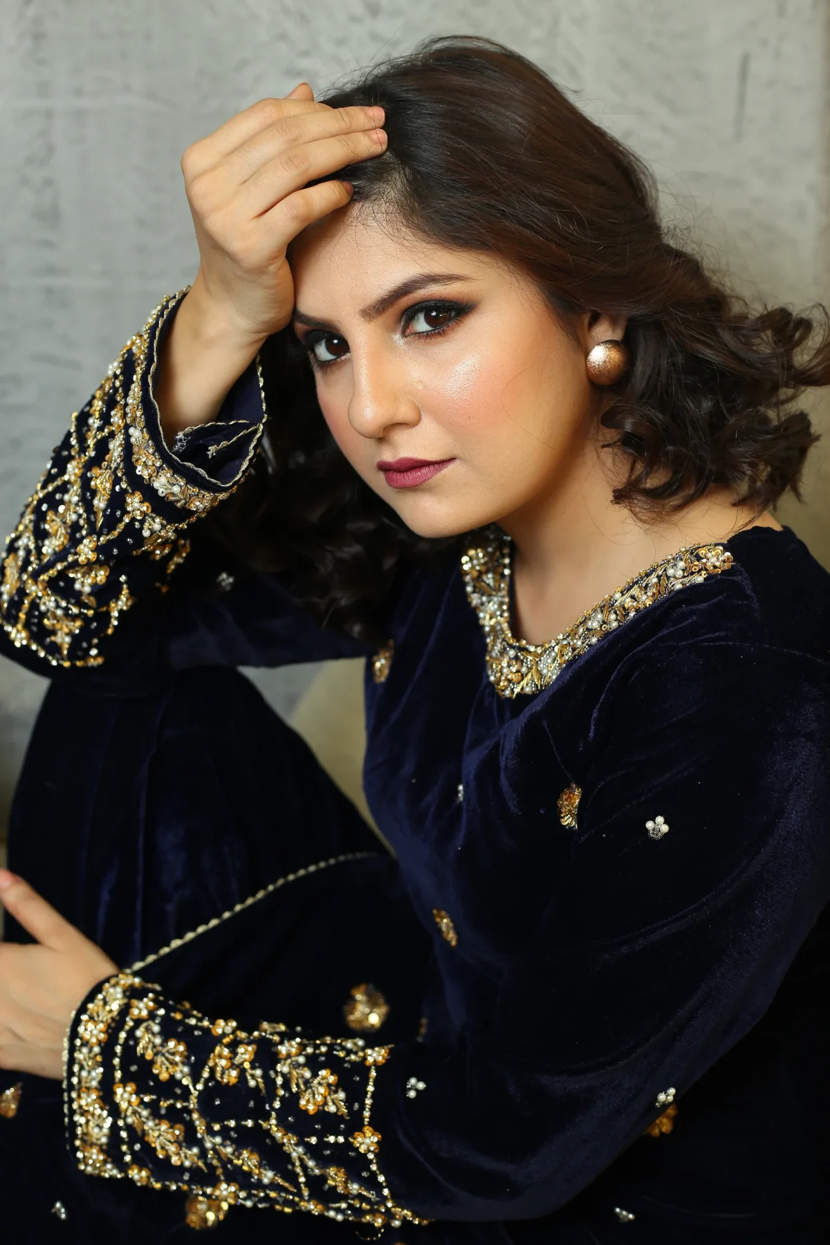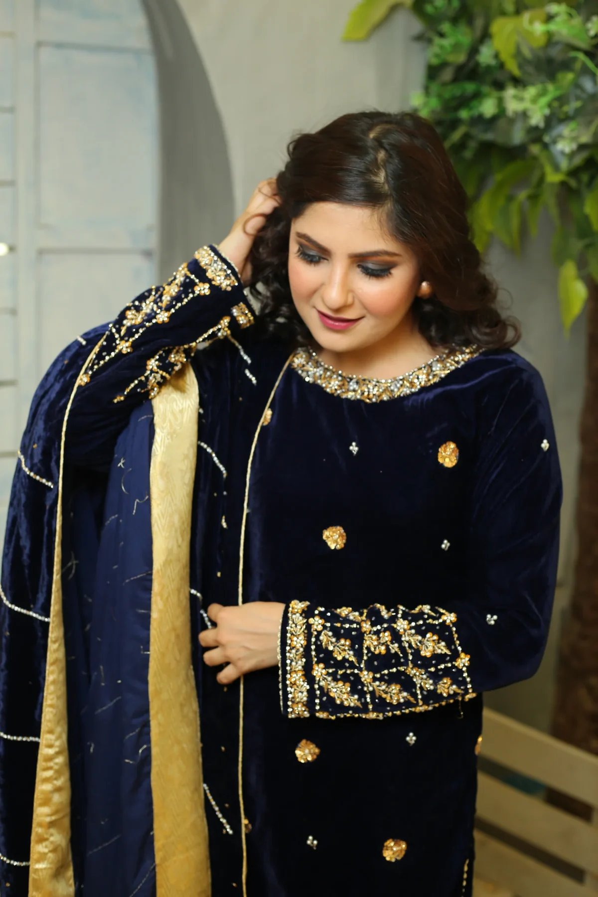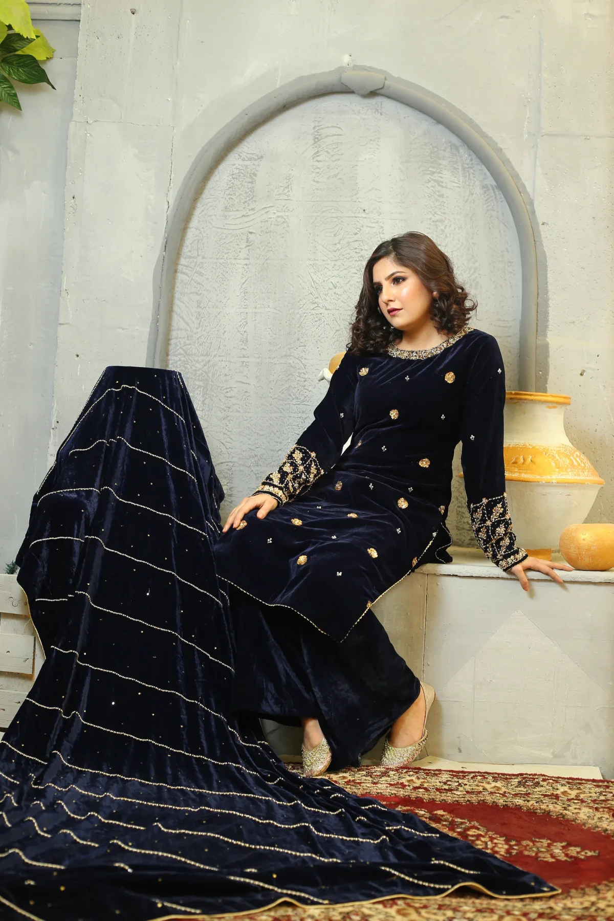 Indulge in the luxurious softness of 9000 micro velvet with this elegant 2-piece set. The shirt is meticulously crafted with complete handwork, showcasing exquisite embroidery that adds depth and sophistication to the rich velvet fabric. Paired with a beautifully embroidered velvet shawl, this ensemble radiates timeless beauty and elegance. Perfect for formal occasions, weddings, or festive celebrations, this set combines both comfort and style. The shawl, priced at PKR 20,000, completes the look with its intricate handwork, making this a must-have for those who appreciate high-quality craftsmanship and design.
