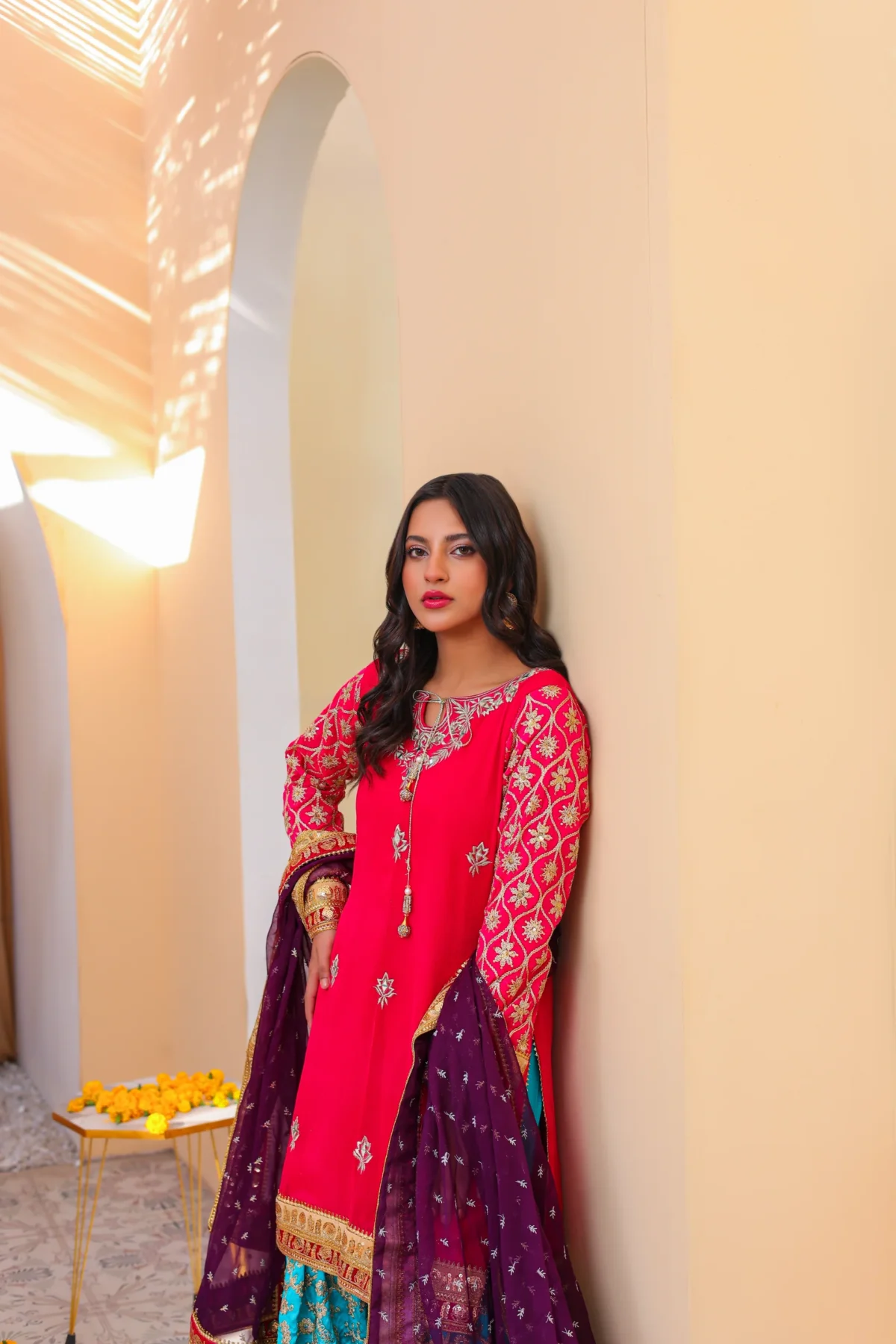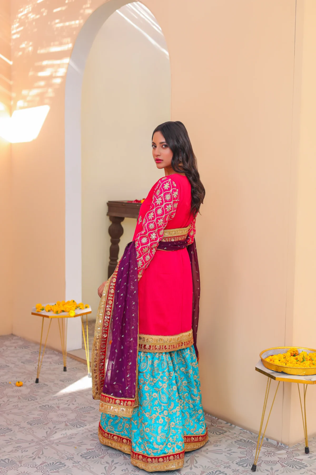 Indulge in the luxury of our JC-ZSG set, featuring a delicately embroidered chiffon shirt with intricate mirror and zari embellishments. The heavy embroidered gharara adds elegance to the look, while the chiffon boti dupatta is finished with beautiful laces. Be the embodiment of sophistication and class.